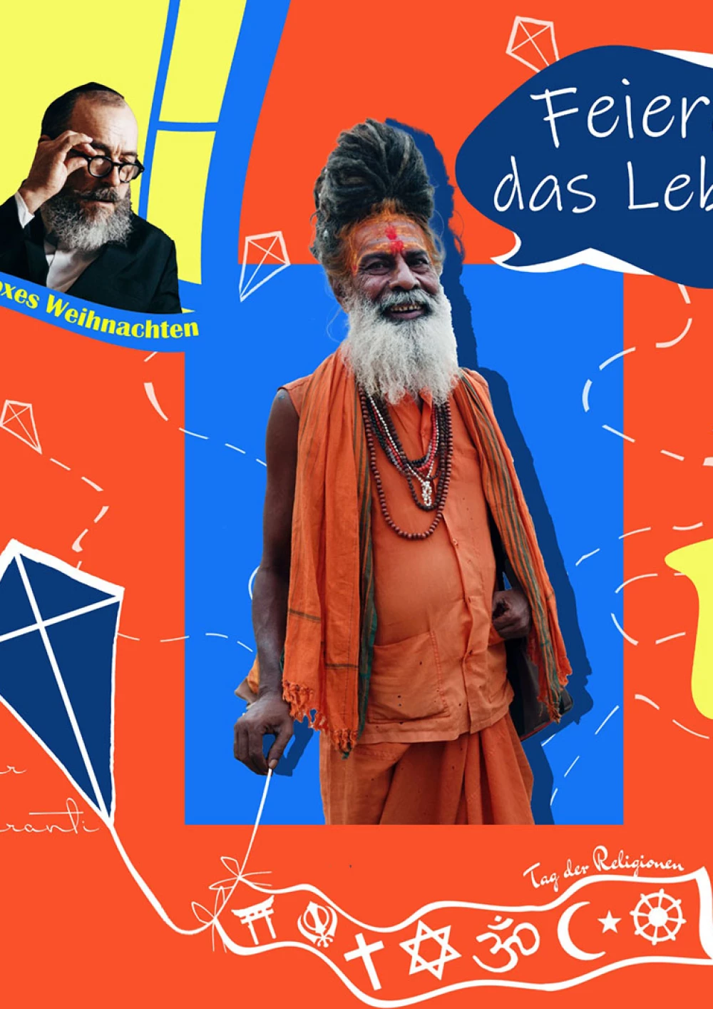 Der Januar beheimatet viele verschiedene Feste wie beispielsweise Makar Sankranti, das orthodoxe Weihnachtsfest, den Feiere das Leben Tag oder den Weltreligionstag. Jeder Feiertag ist für sich wichtig und sorgt in der Welt für Harmonie. Auf dem dargestellten Kalenderblatt sind diese vier Feiertage repräsentiert, wobei Makar Sankranti in den Vordergrund gerückt wird. Dargestellt wird Makar Sankranti durch den ausgewählten indischen Mann, welcher traditionell Drachen steigen lässt. Die Schrift in DrCarbfred Pro unterstützt die indische Kultur durch ihre schnörkelige Sifren. Der Makar Sankranti feiernde Mann ruft mittels einer Sprechblase in einer sehr leserlichen serifenlosen Schrift „Feire das Leben“, um den Betrachter des Kalenderblattes täglich daran zu erinnern, jeden Tag seines Lebens zu genießen und auszukosten. Das Geschehen des Drachensteigenlassens wird von dem orthodoxen Mann kritisch beäugt, welcher sich aus dem Fenster lehnt, um dort traditionell Kerzen aufzustellen. Die Schrift ist wie ein Heiligenschein über dem Mann dargestellt, um dadurch die Verbindung zu dem Heiligen zu symbolisieren. Unterhalb des indischen Mannes sind die verschiedenen Symbole verschiedener Religionen dargestellt. Diese sind Grundlage aller Feste und damit die Basis. Die Platzierung der einzelnen Elemente ist mit Bedacht gewählt um eine Geschichte zu erzählen. Die Religionen als Basis jeder Kultur. Dazu gehören auch Feiertage welche nicht auf diesem Kalenderblatt dargestellt wurden. Auf dieser Basis steht der Makar Sankranti feiernde Mann, welcher das Leben feiert und in Harmonie und Einklang mit dem orthodoxen lebt. Der luftige Raum unterhalb der Religionssymbole schafft einen Raum der Entspannung für die Augen, wodurch die Komposition seine volle Kraft entfalten kann. Die Farben sollen für Harmonie sorgen und sind daher an die ausgewählten Bilder angepasst. Blau ist die Farbe der Ruhe, der Besonnenheit, der Objektivität, der Neutralität und Klarheit. Dadurch soll der Betrachter bei der täglichen Betrachtung des Kalendermotivs diese Werte erfahren. Die Farbe Orange im Hintergrund des indischen Mannes schafft einen Kontrast und stellt gleichzeitig Makar Sankranti in den Vordergrund. Dieses Fest symbolisiert Lebensfreude und wird durch die entsprechende Farbe in ihrer Bedeutung unterstützt. Gleichzeitig wird die Farbe Orange mit Neugier und Kreativität verbunden und schafft durch ihre Farbigkeit im Zentrum einen Anziehungspunkt. Weitere Farbtonalitäten von Blau und Orange wurden in der Komposition verwendet, um das Werk nicht zu überladen. Für Ausgleich uns Spannung sorgt die dritte ergänzte Farbe weiß, welche in ihrer Bedeutung von Reinheit Kernelemente weiter in den Fokus setzt ohne dabei dominant zu wirken.Der Januar beheimatet viele verschiedene Feste wie beispielsweise Makar Sankranti, das orthodoxe Weihnachtsfest, den Feiere das Leben Tag oder den Weltreligionstag. Jeder Feiertag ist für sich wichtig und sorgt in der Welt für Harmonie. Auf dem dargestellten Kalenderblatt sind diese vier Feiertage repräsentiert, wobei Makar Sankranti in den Vordergrund gerückt wird.