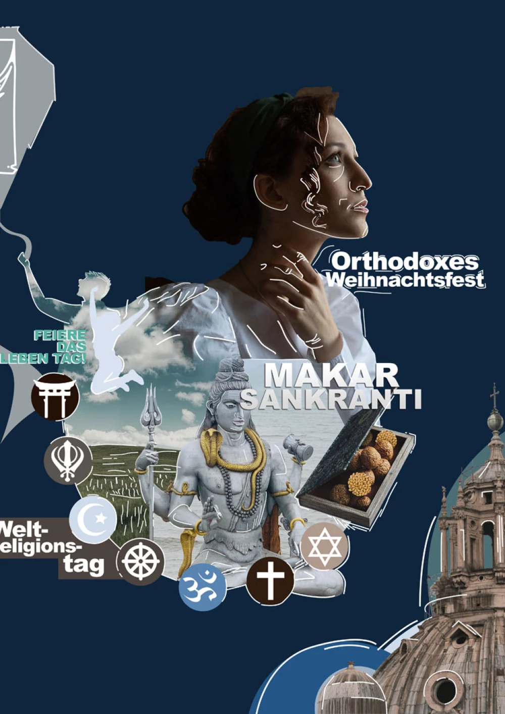Als Hauptmotiv für den Monat Januar des interkulturellen wholidays Kalenders steht das hinduistische Fest “Makar Sankranti”. Die betende Frau in indisch-festlicher Gewandung ist Mittelpunkt der Komposition, welche von Zuckerrohr umgeben ist und auf einer gelben Sonne steht. In einer radialen Anordnung bilden die weiteren Feste wie der Weltreligionstag, das Orthodoxe Weihnachtsfest sowie das “Feiere das Leben Tag” die Struktur der Seite, welche in handgezeichneten Bildern die jeweiligen Motive abbilden. Durch die illustrierten Elemente und dem Hauptmotiv entsteht ein Kontrast, der das Fest Makar Sankranti in den Vordergrund stellt. Mit einem Kalt-Warmkontrast deuten die ausgewählten Farben auf die Sonnenwende an, welche bei diesem Fest zelebriert wird.