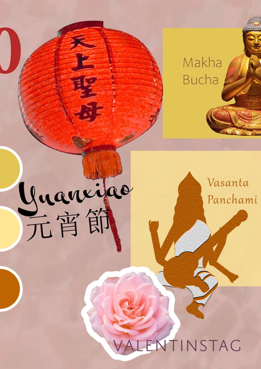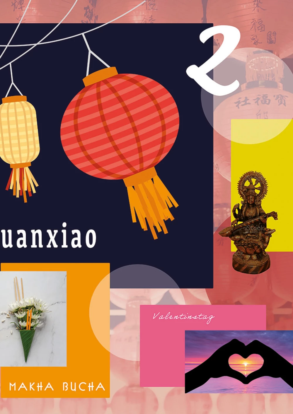 Im Februar steht das chinesische Laternenfest Yuanxiao im Mittelpunkt. Es entstammt der buddhistischen Tradition, Laternen zu entzünden, um Böses abzuwehren. Heute schließt es das chinesische Neujahrfest ab. Da fast alle festlichen Aktivitäten um die Laterne kreisen, sind sie gleich zweimal verbildlicht: einmal in einer Version des zu diesem Fest beliebten Clip-Art-Stils und einmal als Foto im Hintergrund, das die überwältigende Menge der Laternen erfahrbar macht. Weitere Feiertage in diesem Monat sind Makha Bucha (Verehrung der Lehre Buddhas mit den abgebildeten Dreifachen Opfergaben), der Valentinstag (hoffnungsvolle Liebe visualisiert durch Licht im Herz aus Händen) und Vasanta Panchami (Fest zum Frühlingsanfang und zu Ehren der hinduistischen Göttin der Weisheit Saraswati, deren Statue auf typisch senfgelbem Hintergrund steht).