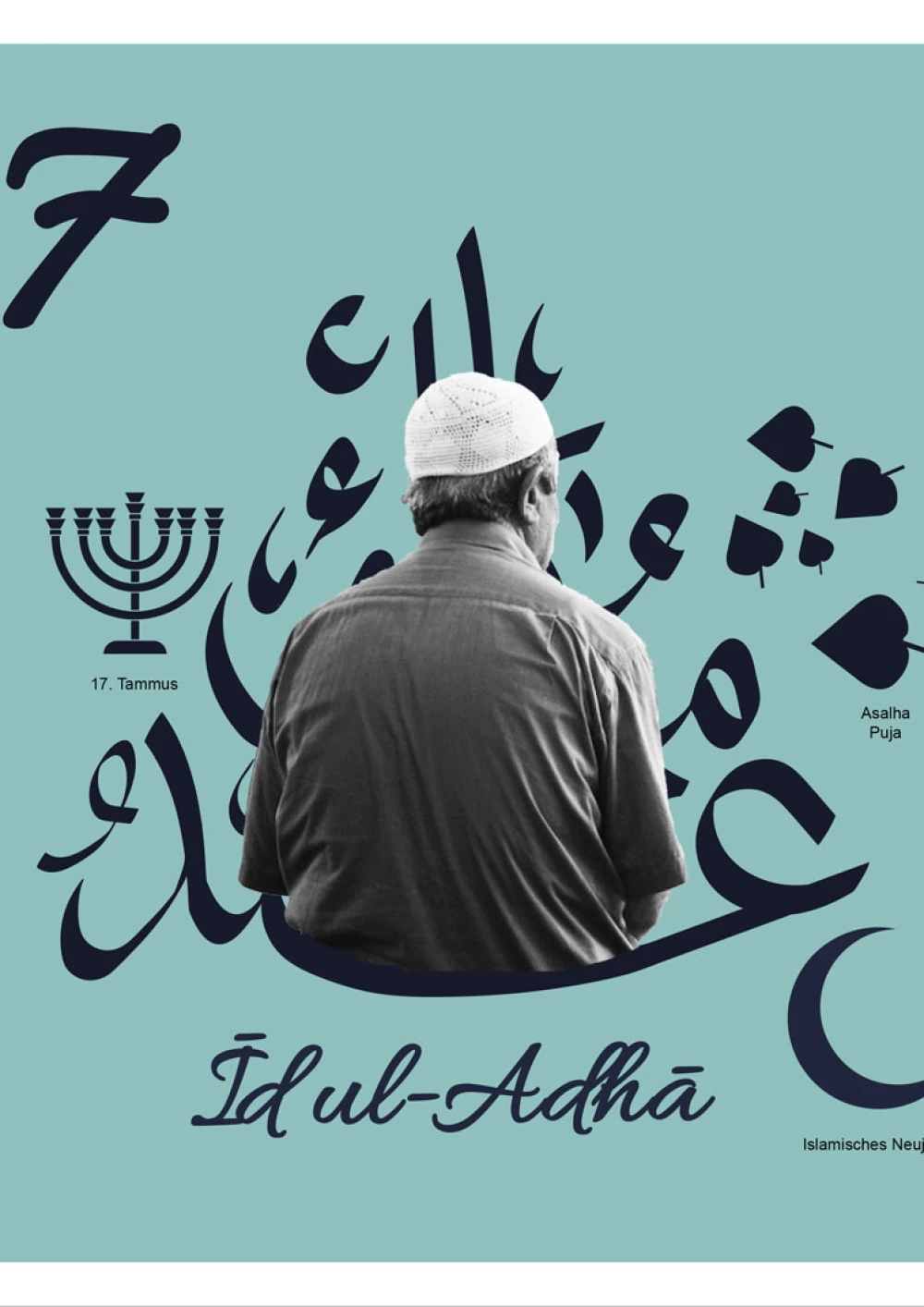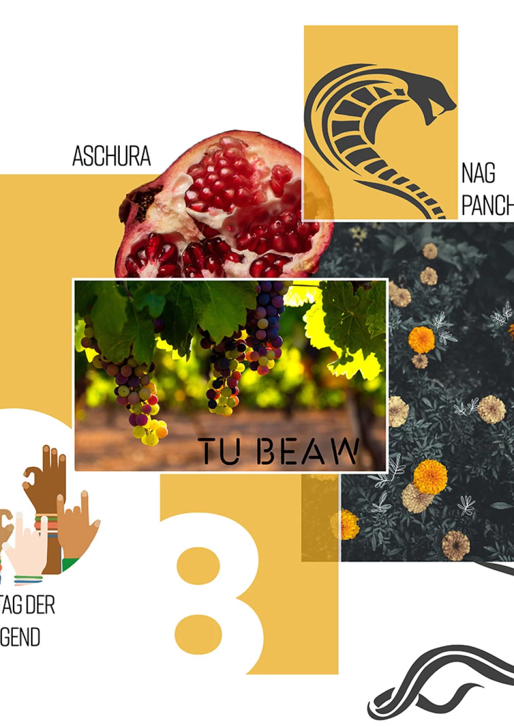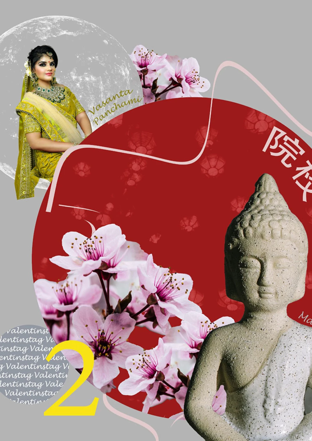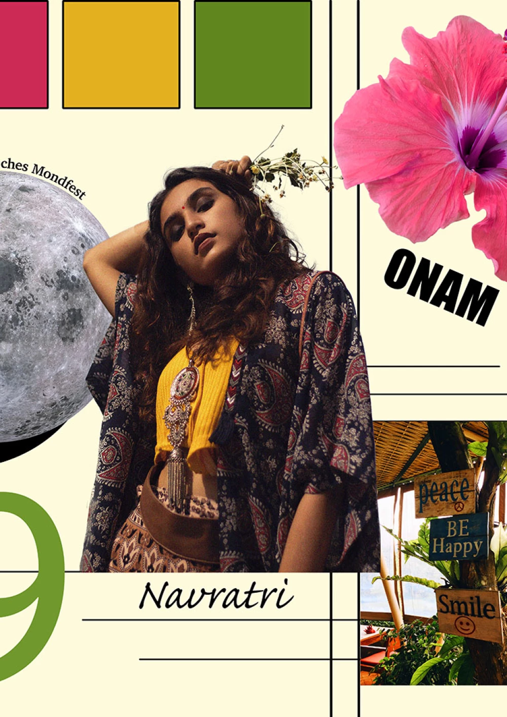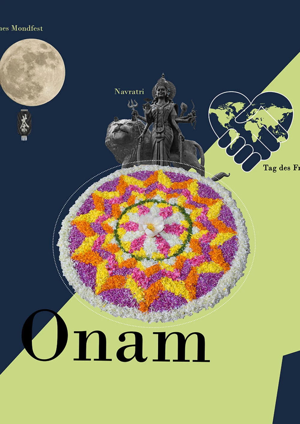 Im Fokus der Komposition liegt der hinduistische Feiertag Onam. Der farbenfrohe Feiertag wird durch die drei Hauptfarben des Festes – rosa, grün und gelb – hervorgehoben, sowie durch die intensive rosa Hibiskusblüte symbolisiert. Einen weiteren Blickfang der Komposition bildet die präsente Frau in der Mitte. Sie steht für den hinduistischen Feiertag Navratri, bei dem die hinduistischen Göttinnen gefeiert werden. Die Farben ihrer Kleidung sind dunkler, jedoch harmoniert ihr Oberteil perfekt mit dem Farbschema der Komposition. Desweiteren wird das Chinesische Mondfest durch einen schlicht gehaltenen Mond repräsentiert und der internationale Tag des Friedens wird durch ein konzeptuell und farblich passendes Foto repräsentiert. Um der Komposition abschließend etwas Spannung und Dynamik zu verleihen, wurden verschiedene teils sehr geschwungene oder auffallende Schriften gewählt und Linien gezogen, die den Bildern Halt geben, sowie die Komposition in scheinbare Segmente unterteilen.