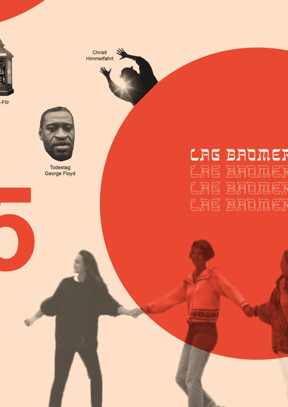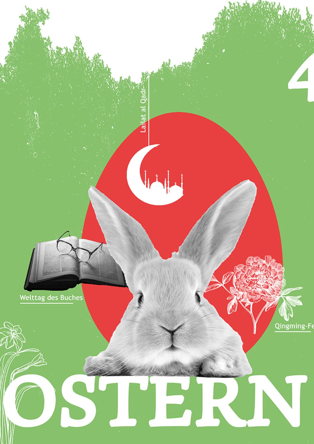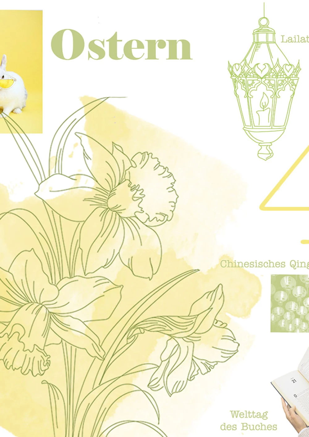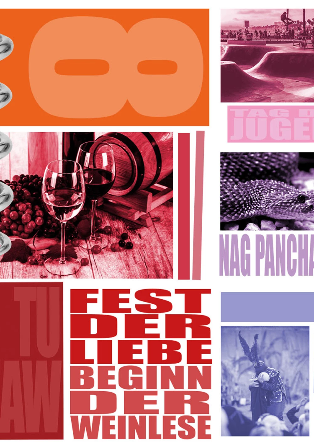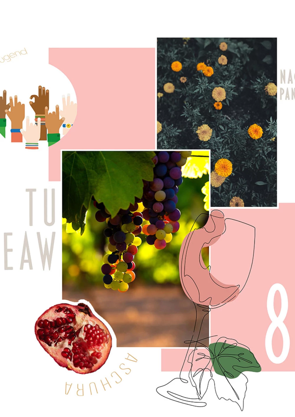 Im Fokus der Komposition liegt der hinduistische Feiertag Onam. Der farbenfrohe Feiertag wird durch die drei Hauptfarben des Festes – rosa, grün und gelb – hervorgehoben, sowie durch die intensive rosa Hibiskusblüte symbolisiert. Einen weiteren Blickfang der Komposition bildet die präsente Frau in der Mitte. Sie steht für den hinduistischen Feiertag Navratri, bei dem die hinduistischen Göttinnen gefeiert werden. Die Farben ihrer Kleidung sind dunkler, jedoch harmoniert ihr Oberteil perfekt mit dem Farbschema der Komposition. Desweiteren wird das Chinesische Mondfest durch einen schlicht gehaltenen Mond repräsentiert und der internationale Tag des Friedens wird durch ein konzeptuell und farblich passendes Foto repräsentiert. Um der Komposition abschließend etwas Spannung und Dynamik zu verleihen, wurden verschiedene teils sehr geschwungene oder auffallende Schriften gewählt und Linien gezogen, die den Bildern Halt geben, sowie die Komposition in scheinbare Segmente unterteilen.