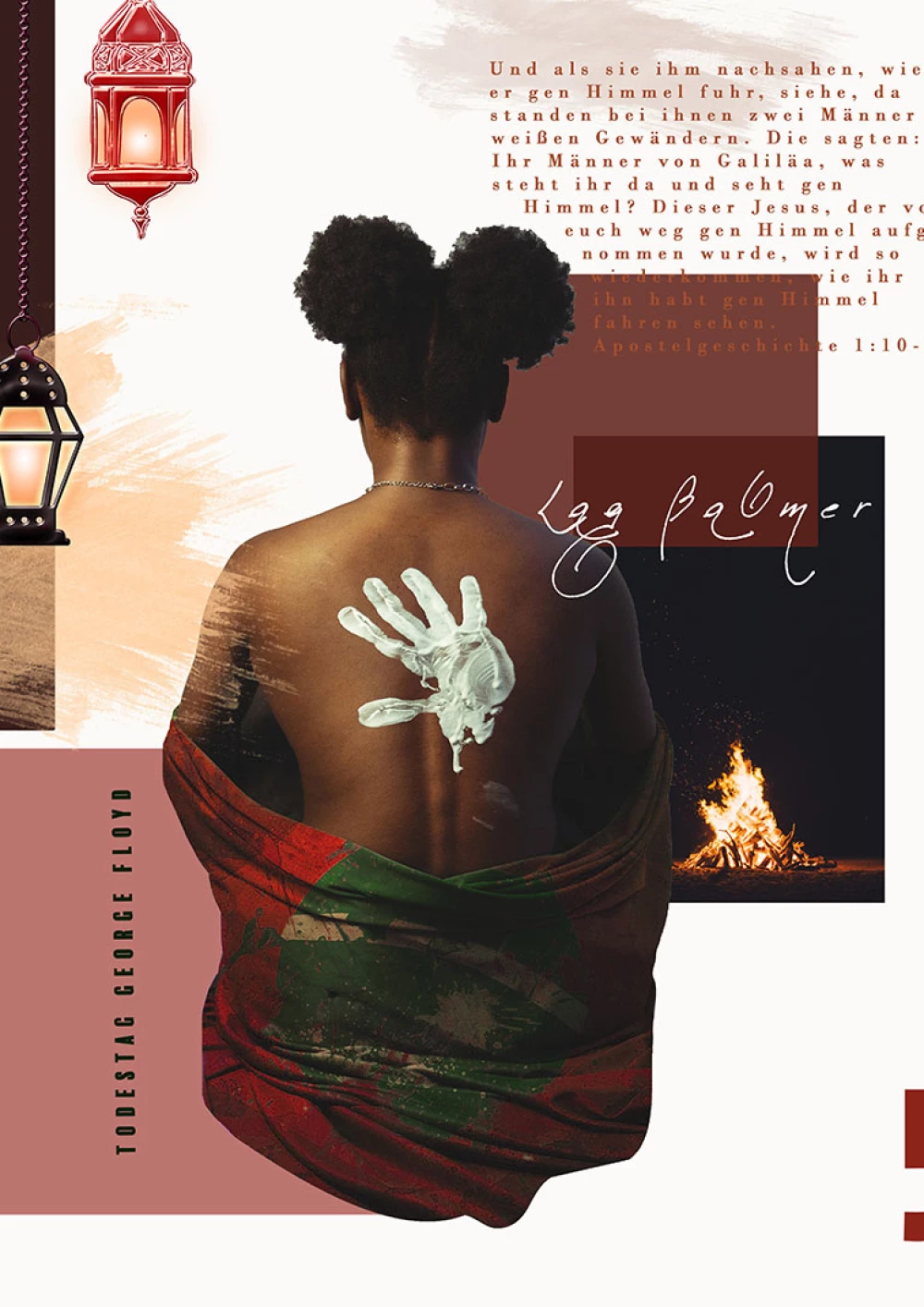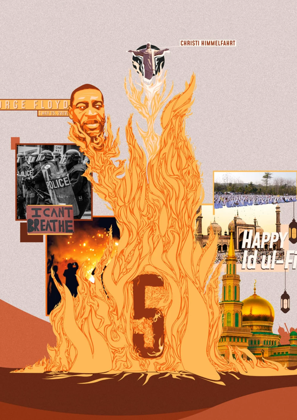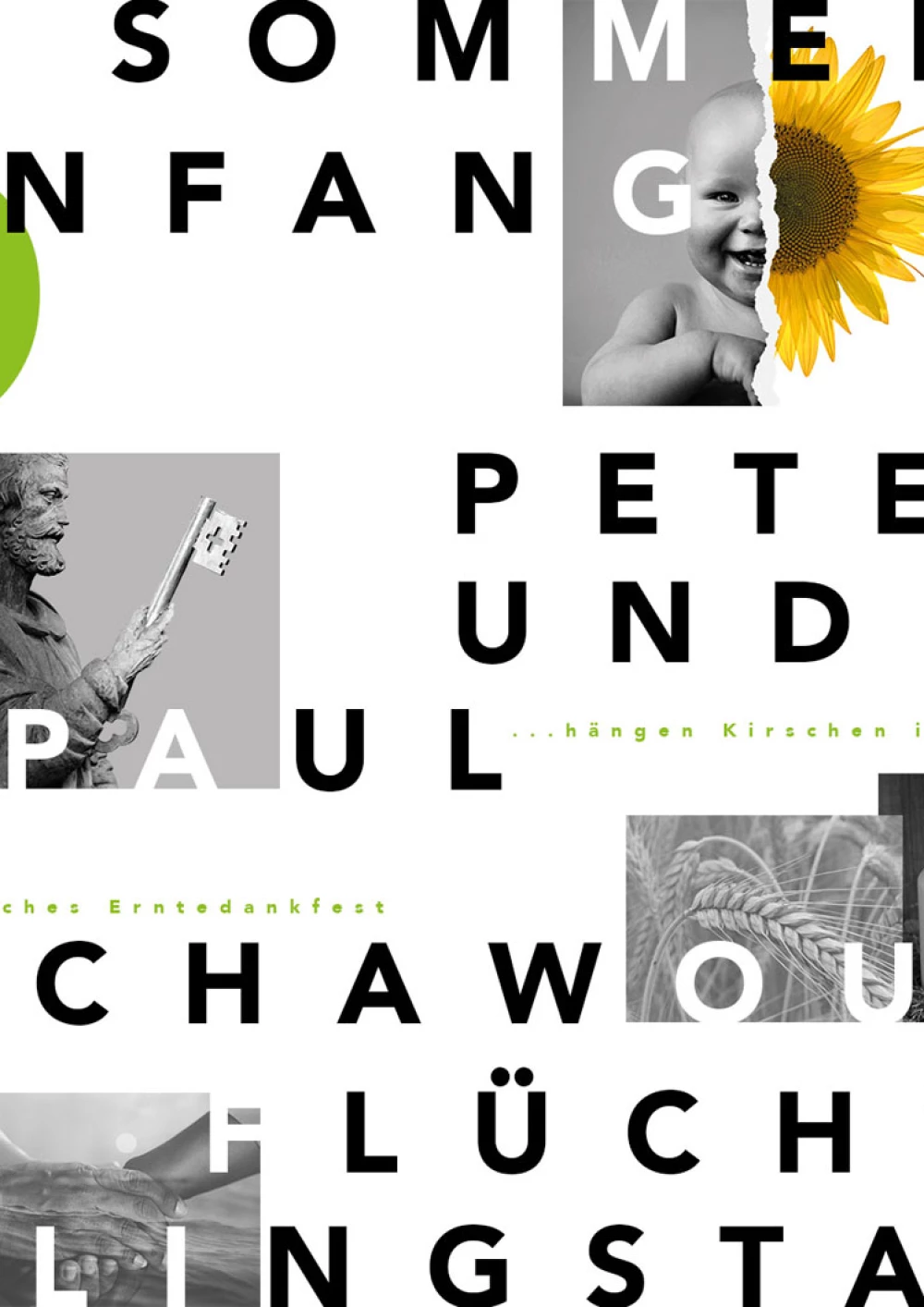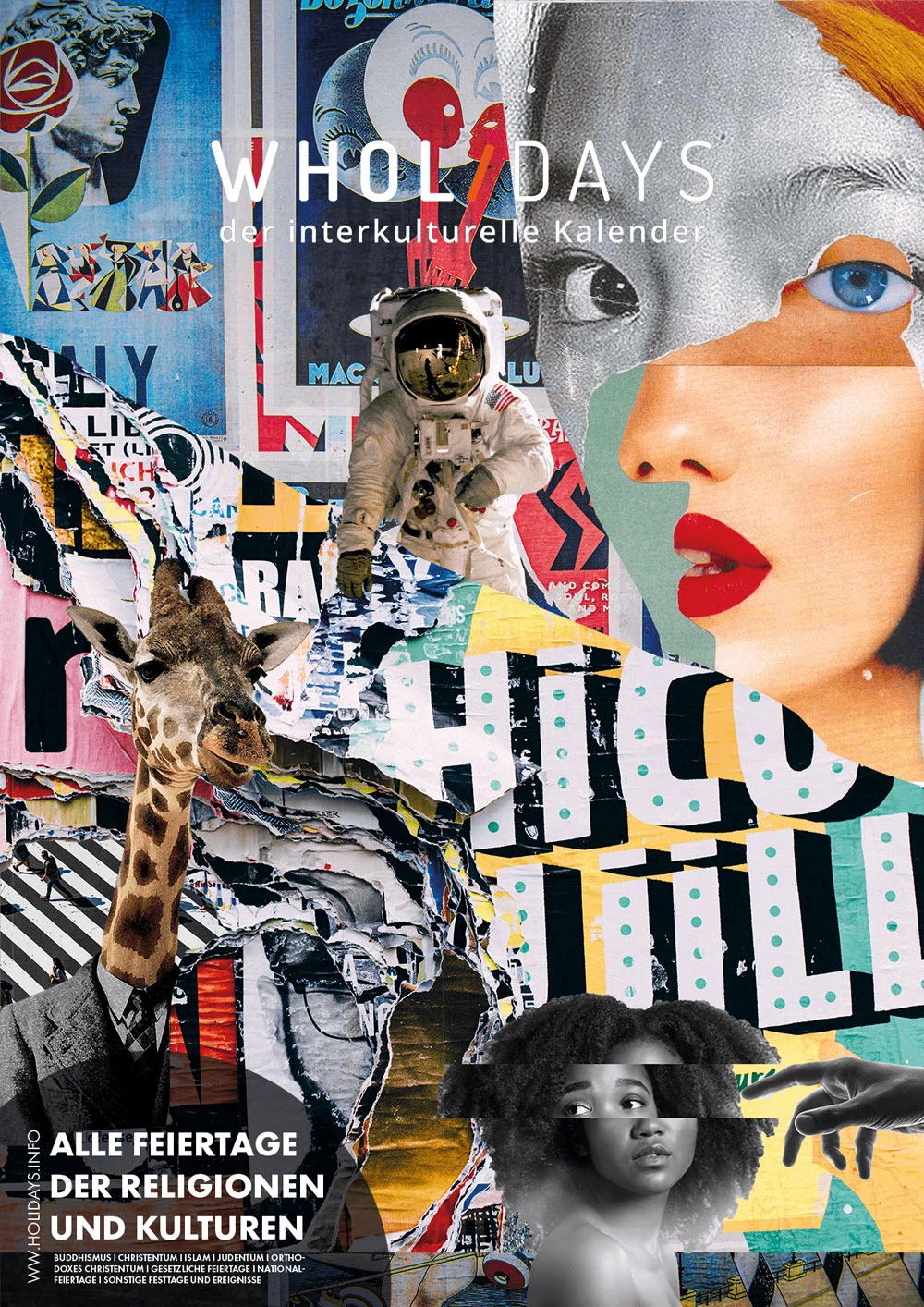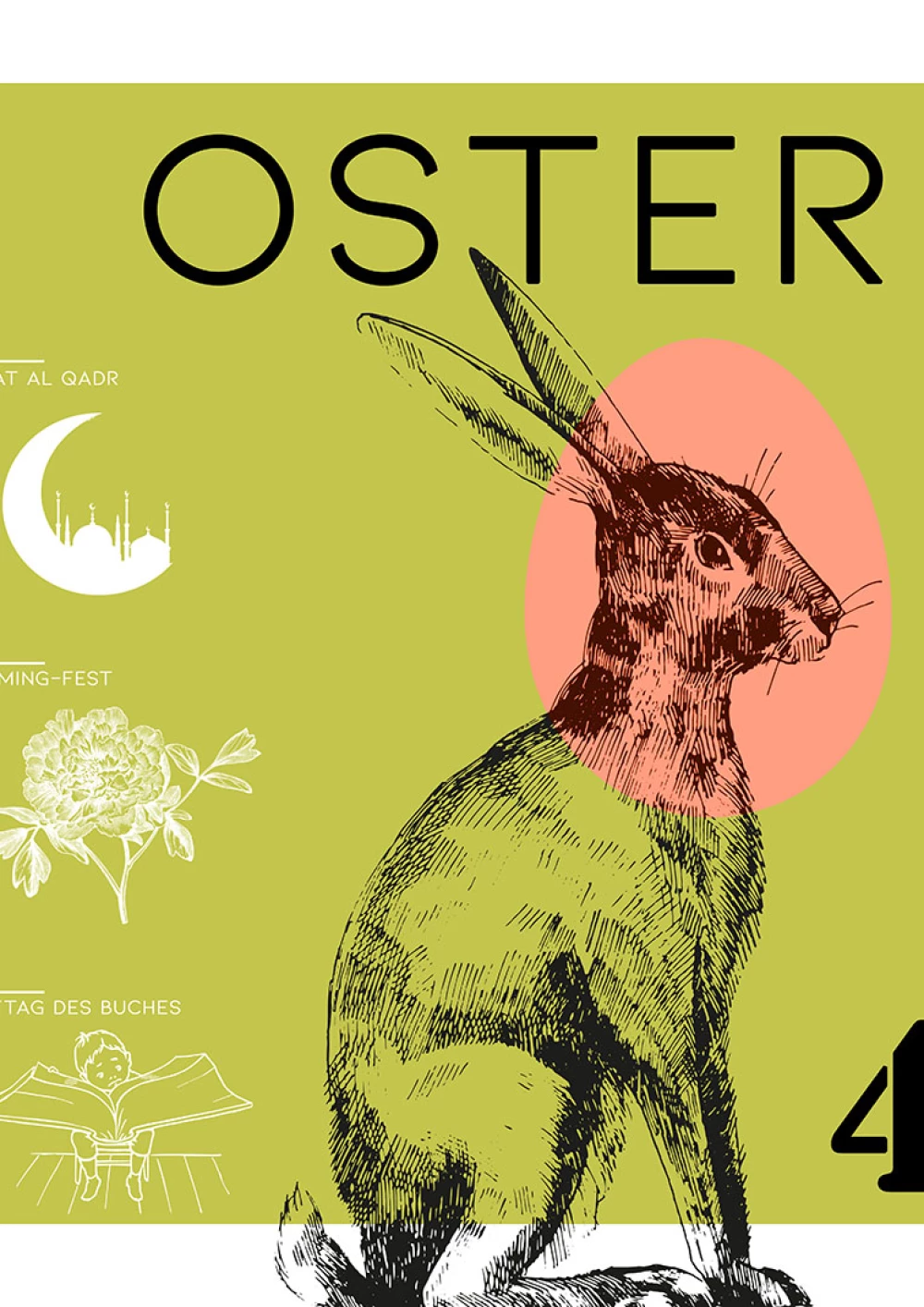 Im Fokus der Komposition liegt der hinduistische Feiertag Onam. Der farbenfrohe Feiertag wird durch die drei Hauptfarben des Festes – rosa, grün und gelb – hervorgehoben, sowie durch die intensive rosa Hibiskusblüte symbolisiert. Einen weiteren Blickfang der Komposition bildet die präsente Frau in der Mitte. Sie steht für den hinduistischen Feiertag Navratri, bei dem die hinduistischen Göttinnen gefeiert werden. Die Farben ihrer Kleidung sind dunkler, jedoch harmoniert ihr Oberteil perfekt mit dem Farbschema der Komposition. Desweiteren wird das Chinesische Mondfest durch einen schlicht gehaltenen Mond repräsentiert und der internationale Tag des Friedens wird durch ein konzeptuell und farblich passendes Foto repräsentiert. Um der Komposition abschließend etwas Spannung und Dynamik zu verleihen, wurden verschiedene teils sehr geschwungene oder auffallende Schriften gewählt und Linien gezogen, die den Bildern Halt geben, sowie die Komposition in scheinbare Segmente unterteilen.