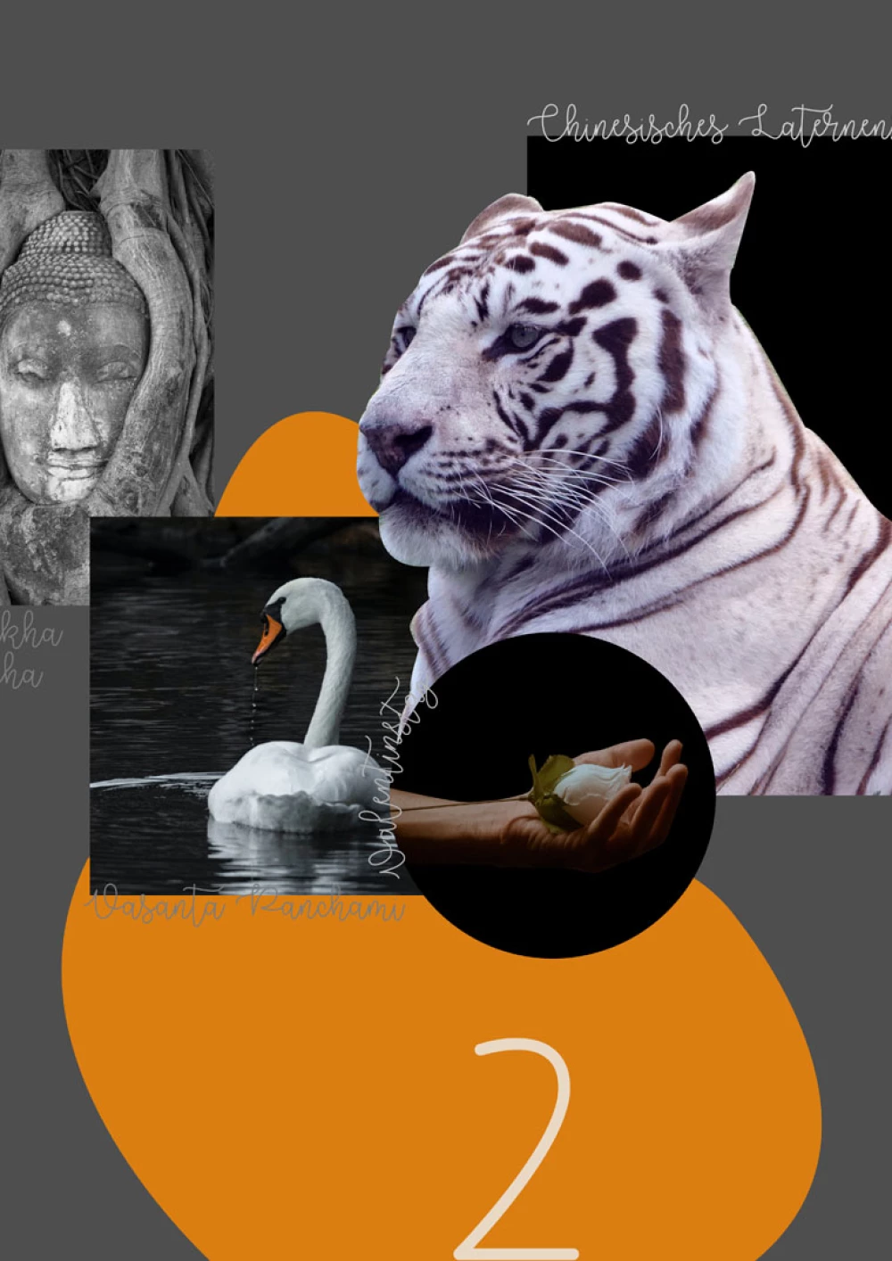 Auf diesem Kalenderblatt werden die Feiertage Yuanxiao, auch bekannt als das chinesische Laternenfest, Vasanti Panchami, der Valentinstag und Makha Bucha dargestellt. Diese in ihrer Grundart sehr unterschiedlich anmutenden Feiertage verbinden uns Menschen auf Grund der Tatsache, dass sie uns Struktur und Halt geben. In der Regel werden diese zusammen mit anderen Menschen verbracht, um neue Erinnerungen zu schaffen und uns daran zu erinnern das Leben zu genießen. Fokus dieses Kalenderblattes liegt auf dem Feiertag Xuanxio, durch die prominente Darstellung der Laternen, welche traditionell an diesem Tag in den Himmel emporsteigen, im Zentrum. Die umrandende Form des Kreises wurde gewählt, da das religiöse Symbol der chinesischen Kultur (Taoismus/ Daoismus) Ying und Yang ist und die Silhouette ein Kreis ist. Neben den Laternen sind in dem Kreis auch Kirschblüten dargestellt, welche den Beginn des Frühlings repräsentieren. Mit der Schrift Adobe Heitistd und durch die Verwendung der chinesischen Schriftzeichen wird der Kultur zusätzlich in den Vordergrund gestellt. Neben diesem Feiertag wird auf dem Kalenderblatt auch der Feiertag Vasanti Panchami zelebriert. Als Motiv wurde hierfür eine Frau in einem gelben, wie die blühende senffarbenen, Sari gewählt. Der gelbe Sari wird traditionell an diesem Feiertag von den indischen Frauen getragen. In Europa wird in diesem Kalendermonat der Valentinstag gefeiert. Dieses Fest der Liebe und wird von Paaren zelebriert. Dieser Feiertag ist durch ein Textfeld neben dem Hauptfest dargestellt. Hierfür wurde die Schrift Lucida Handwriting gewählt, um einem handgeschriebenen Liebesbrief anzumuten. Für den verbleibenden Feiertag Makha Bucha wurde das Motiv des Buddhas gewählt, da an diesem Feiertag an die spontane Versammlung von 1250 Schülern des Buddhas erinnert wird. Sowohl Yuanxiao, als auch Makha Bucha bemessen dem Vollmond eine besondere Bedeutung im Februar bei, weshalb dieser ebenfalls auf dem Kalenderblatt dargestellt wird. Die Nummer 2 steht für den 2. Kalendermonat Februar. Hierfür wurde die Schrift Adobe Gurmukhi verwendet, da diese sehr gut zu den runden Formen der Gesamtposition passt. Die Farbe rot wurde gewählt, da sowohl Yuanxiao, als auch der Valentinstag mit dieser Farbe assoziiert werden. Die Farbe steht für Liebe und Leidenschaft und schafft einen Kontrast zu dem kühlen Grau der Buddha Statue. Die Hitze der roten Farbe im Kontrast zu dem kühlen Grauton verstärken den Effekt der Lebendigkeit und unterstützen die Tiefenwirkung. Die Farbe gelb steht im Kontrast zu dem dominanten rot und bezweckt Heiterkeit und Optimismus beim Betrachten. Zusätzlich wird der Feiertag Vasanti Panchami durch die Farbe dargestellt.Auf diesem Kalenderblatt werden die Feiertage Yuanxiao, auch bekannt als das chinesische Laternenfest, Vasanti Panchami, der Valentinstag und Makha Bucha dargestellt. Diese in ihrer Grundart sehr unterschiedlich anmutenden Feiertage verbinden uns Menschen auf Grund der Tatsache, dass sie uns Struktur und Halt geben. In der Regel werden diese zusammen mit anderen Menschen verbracht, um neue Erinnerungen zu schaffen und uns daran zu erinnern das Leben zu genießen.