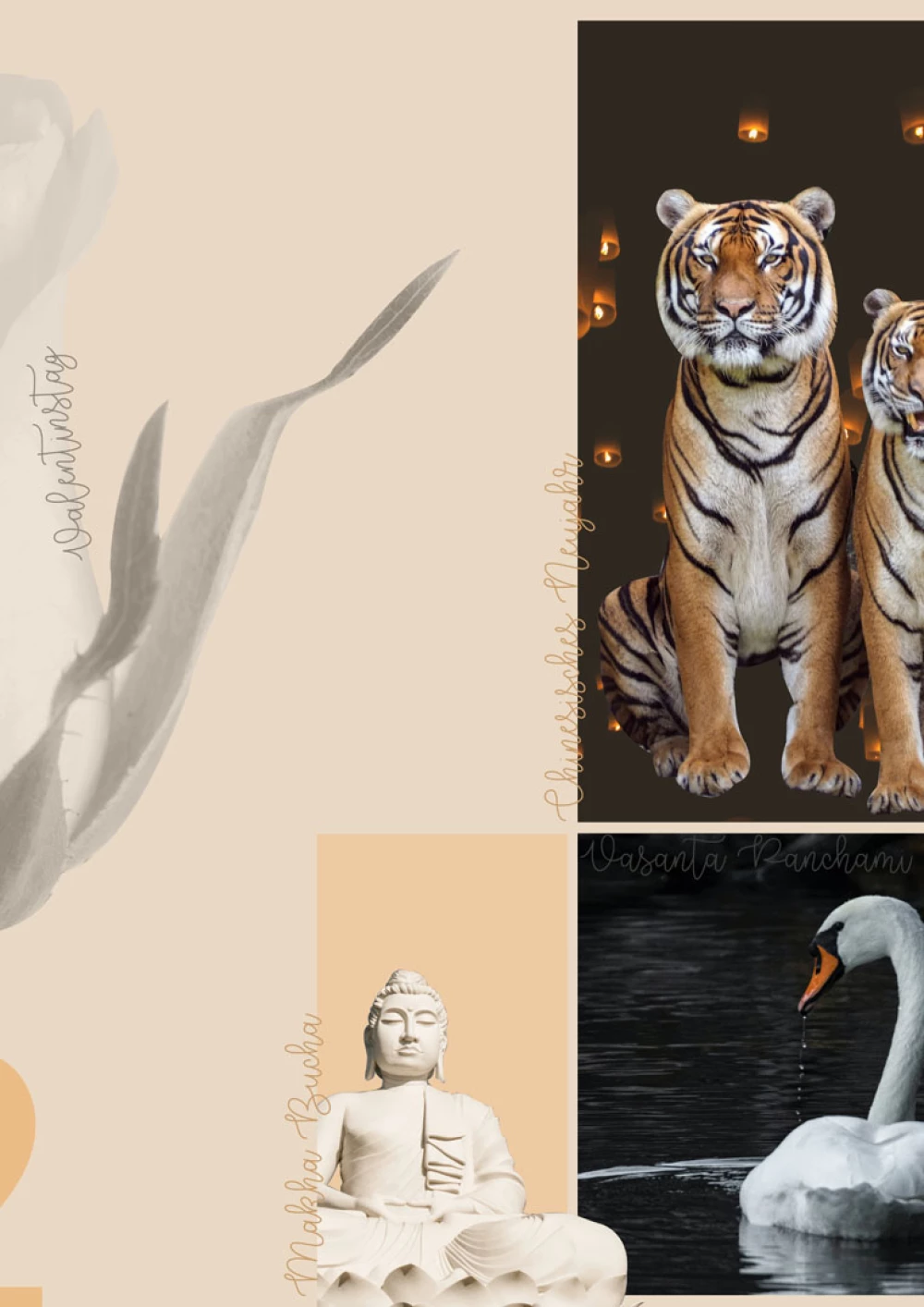 Das Jahr 2022 ist das Jahr des Tigers im Chinesischen Kalender. Am Ende des chinesischen Neujahrs kommen die Leute zusammen, um den Anfang des Frühlings zu feiern. Gemeinsam betrachtet man leuchtende Laternen und Feuerwerk. Gerne werden Yuanxiao (süß gefüllte Mehlklöße) gegessen. Das chinesische Laternenfest ist einer der wichtigsten Festtage in China. Die Geschichte dieses Feiertages kann mehr als 2.000 Tage zurückverfolgt werden. Die Legende der Laterne besagt, dass es vor langer Zeit viele bösartige wilde Tiere und Vögel gab, die außerordentlich das Leben und die Sicherheit der Einheimischen beeinträchtigte. Zum Selbstschutz mussten die Menschen jene wilden Tiere töten. Eines Tages ging ein heiliger Vogel vom Himmel zufällig verloren und fiel auf die sterbliche Welt. Jedoch betrachtete ein unwissender Jäger den Vogel als eines der wilden Tiere und tötete ihn. Der Himmelkaiser war sehr zornig und befahl seinen Soldaten alles am fünfzehnten Tag des ersten Monats in Brand zu stecken und zu verbrennen. Die Tochter des Himmelkaisers war sehr freundlich und wollte es nicht geschehen lassen. So kam sie heimlich in die sterbliche Welt und informierte die Menschen. Die Leute waren erschrocken und versuchten eine Lösung auszudenken. Ein alter Mann war auf eine Idee gekommen. Er sagte, dass jede Familie am 14., 15. und 16. Tag des 1. Mondmonats Laternen und Feuerwerke entzünden sollte, so dass der Kaiser denken würde, dass alles schon ausgebrannt wäre. Jeder stimmte zu und war damit beschäftigt, sich darauf vorzubereiten. Am 15. Tag des 1. Mondmonats sah der Himmel-Kaiser herab und es gab rotes Feuer und donnerndes Krachen überall für drei Nächte. Er dachte, dass die Leute bestraft worden waren. Dadurch gelang es ihnen, ihr Leben und Eigentum zu behalten. Von da an erleuchten die Leute Laternen und Feuerwerke am 15. Tag des 1. Mondmonats, um den Erfolg zu feiern. Einer weiteren Erzählung zufolge soll der Kaiser Hanmingdi am Anfang der Östlichen Han Dynastie (25-220) war ein Verfechter des Buddhismus. Er hörte, dass einige Mönche Laternen in den Tempeln entzündeten, um Buddha Respekt am fünfzehnten Tag des ersten Mondmonats zu erweisen. Deshalb befahl er, dass alle Tempel, Haushalte und königliche Paläste an diesem Abend Laternen anzünden sollten. Diese buddhistische Etikette bildete allmählich einen großartigen Festtag unter den Menschen. Der Feiertag „Vasanta Panchami“ ist ein Fest des Hinduismus. Dieses Fest markiert den Beginn des Frühlings (Vasant = Frühling) und huldigt die Göttin Saraswati, welche unter anderem von einem Schwan begleitet wird. Zu den Festtagsbräuchen zählt für die Frauen das Tragen eines gelben Saris sowie das Niederlegen Ihrer Arbeitsutensilien vor der Göttin Saraswati für Künstler, geistig Arbeitende, Schüler, Studenten, Musiker, Maler, Autoren und Journalisten. An diesem Tag wird die biologische Fruchtbarkeit der Göttin gefeiert, die zu Vasantpanchami, dem Beginn des indischen Frühlings, sichtbar wird. Der Valentinstag war ursprünglich der Gedenktag für den Bischof Valentin von Terni, einem Heiligen, um den sich viele Legenden ranken. Er soll unter anderem Soldaten verheiratet haben, obwohl dies verboten war. Die Tradition, an diesem Tag die romantische Liebe zu feiern, entwickelte sich im 14. Jahrhundert. Symbole dieses Feiertages sind Herze, Rosen, Briefe, Tauben und die Figur des geflügelten Liebesboten Cupido. Der Feiertag Makha Bucha ist ein Fest des Buddhismus. Der Ursprung des Festes geht zurück auf die Legende über ein spontanes Treffen von 1.250 Mönchen. Sie alle hatten unabhängig voneinander entschieden, den Buddha aufzusuchen, der zu jener Zeit im Bambushain (Weluwan-Wald) nahe Rājagṛha (im historischen Königreich Magadha) lebte. Der Buddha hielt an diesem Tag des Vollmonds des dritten Monats vor den versammelten Mönchen seine „Ovada-Patimokkha Gatha“, die Patimokkha-Ermahnungen. Der Legende nach soll er damals auch verkündet haben, dass er innerhalb von drei Monaten sterben werde. Zu den Feierlichkeiten gehören für die gläubigen Buddhisten religiöse Aktivitäten wie Gabenspenden an die Mönche und/oder dem Anhören einer Mönchspredigt. Nach Einbruch der Dunkelheit leiten die Mönche die Gläubigen zu einer Kerzenprozession, wobei das Gebäude oder der Buddha dreimal umrundet wird. Sowohl die Mönche als auch die Gläubigen tragen die Dreifachen Opfergaben: eine brennende Kerze, drei brennende Räucherstäbchen und einen Blumenkranz oder eine frische Blüte. Durch die. mehrfache „Dreiheit“ soll man sich auf die drei Juwelen des Buddhismus besinnen: Buddha, seine Lehre (Dharma) und die Mönchsgemeinschaft (Sangha).