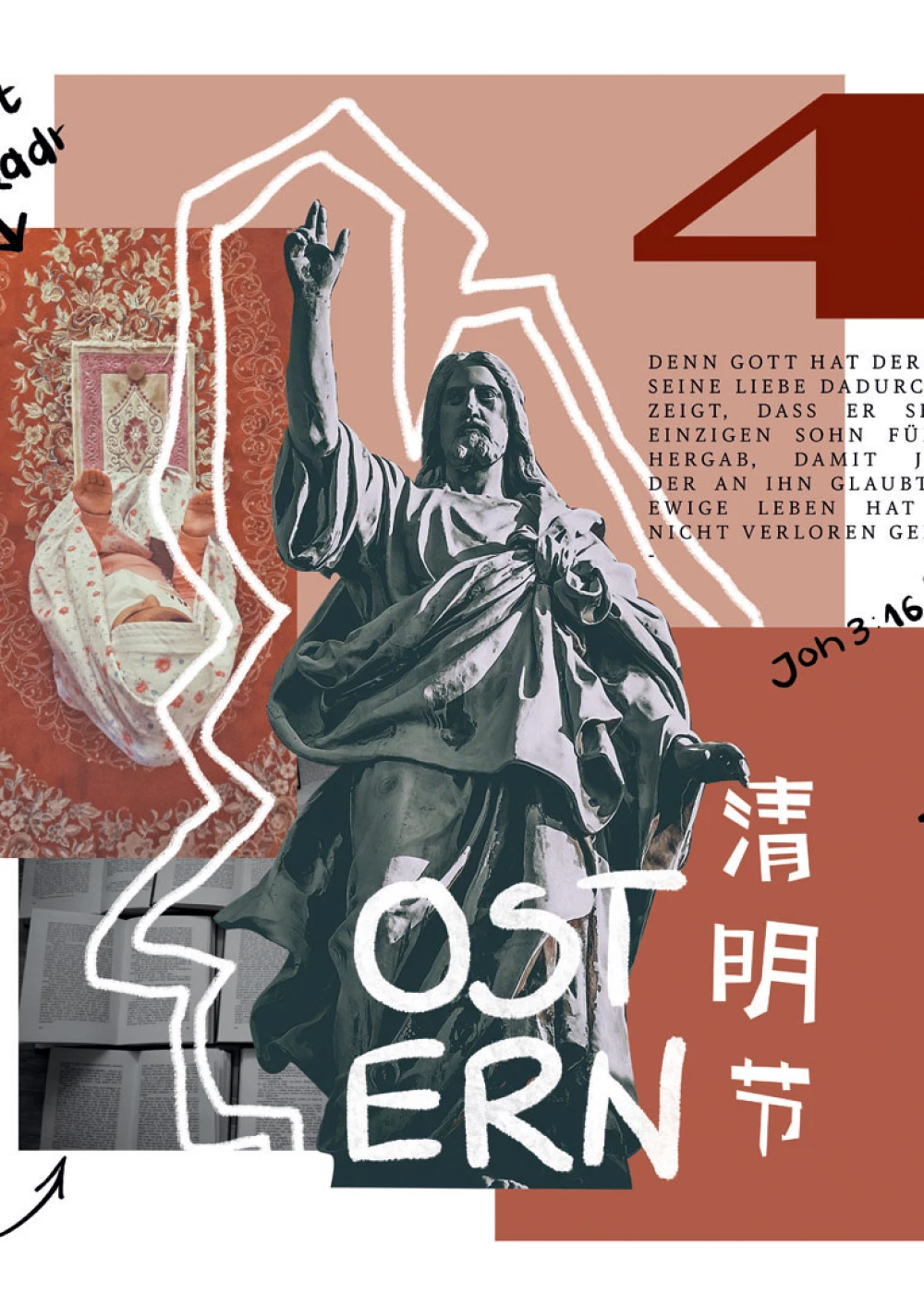 Farblich habe ich den Oktober den Braun- und Orangetönen des Herbstes und des Laubes angepasst. Das Pergament als Hintergrund spielt auf die Zeit des Lesens und der Gemütlichkeit zu dieser Zeit an. Das wohl dominanteste Bild sind die vier sich reichende Hände zum „Tag der vereinten Nationen“. Ein Bild sagt mehr als 1000 Worte. Hierbei ist auch wieder Raum zur Interpretation offen, dennoch ist eins klar: verschiedene Nationen und Hautfarben sind vereint, unterstützen einander und treten sich mit Frieden entgegen. Dieser Gedenktag erinnert an den 24. Oktober 1945, an dem die Charta der vereinten Nationen in Kraft trat. Zu den wichtigsten Aufgaben der Vereinigung gehören die Sicherung des Weltfriedens, sowie der Schutz der Menschenrechte. In einem runden Ausschnitt wird im rechten oberen Eck das „Erntedankfest“ dargestellt. An diesem Tag danken Christen, meist nach der Ernte, Gott für Gaben der Natur. Hierzu werden Kirchen mit Gemüse, Getreide und Erntekronen geschmückt. Ich habe das von mir ausgewählte Foto mit einem Effekt bearbeitet, welches aus dem Foto ein Gemälde erscheinen lässt. In der Malerei wurden häufig Stillleben von besonders kostbaren Dingen wie seltene Früchte oder Gegenstände angefertigt. Mit der Darstellung des Gemäldes wollte ich die Kostbarkeit von Lebensmitteln und deren Wertschätzung, welche an dem Erntedankfest sichtbar wird, darstellen. Jom Kippur, der im Judentum gefeierte „Versöhnungstag“ ereignet sich Anfang Oktober. Wie der Name schon sagt geht es darum an diesem Tag zu vergeben, nicht nur anderen, sondern auch selbst Reue zeigen zu können. Zu dieser Zeit wird ebenfalls gefastet, nichts gegessen oder Aktivitäten ausgeführt, welche einem davon ablenken könnten, über das Leben nachzudenken, denn dafür steht der Tag. Sich seine Sünden zu vergegenwärtigen und zu beichten. Die freigestellte Bildgrafik unten links zeigt sich umarmende Menschen. Diese Umarmung soll für Vergebung und Versöhnung stehen. Hoschana Rabba ist der 7. Tag des jüdischen Pilgerfests „Sukkot“, was übersetzt so viel wie „hilf mir doch“ bedeutet. Ein Brauch ist es, mit Gebeten und Bitten beschriebene Briefe in den Himmel „aufsteigen“ zu lassen, in der Hoffnung Gottes Urteile positiv beeinflussen zu können. Bei einem besonderen Gottesdienst an diesem Tag werden in der Synagoge Weidenzweige und Buchweizen auf Tische und auf den Boden geschlagen. Die Bedeutung dieses Brauches ist noch nicht geklärt, ich habe mir jene Pflanzen jedoch als Gestaltungsmittel dieses Feiertags gemacht.