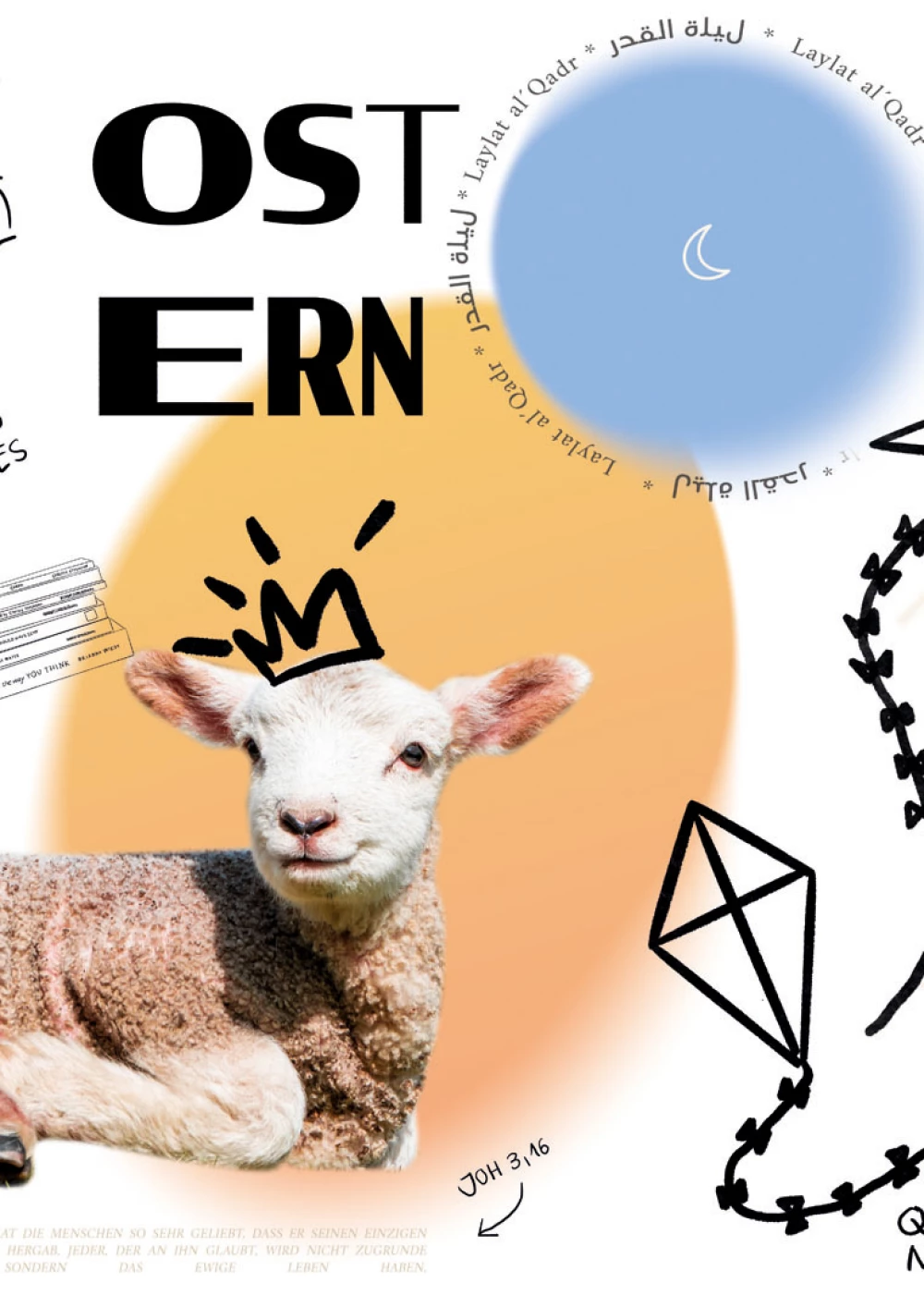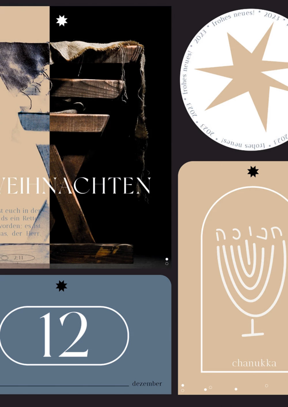 Hier hat jeder Feiertag seinen eigenen eingegrenzten Bereich. Weihnachten als Fokus-Feiertag hat stellt das große Element und das einzige Foto. Deine Krippe erinnert an Christi Geburt, so wie der gewählte Bibelvers. Ein Feuerwerk ist abstrakt-illustrativ dargestellt. Die Chanukkia und der hebräische Schriftzug symbolisieren den jüdischen Feiertag Chanukka. Das Gesamtbild harmoniert durch die Farbgebung und die immer wieder auftretenden Zeichen, Sterne und Kreise.