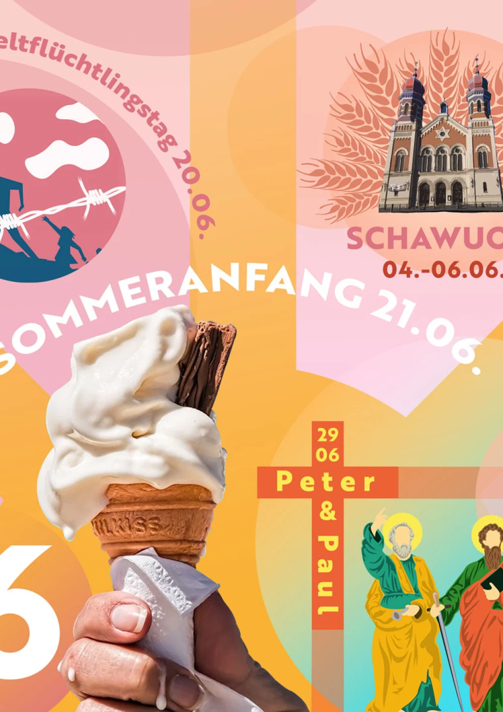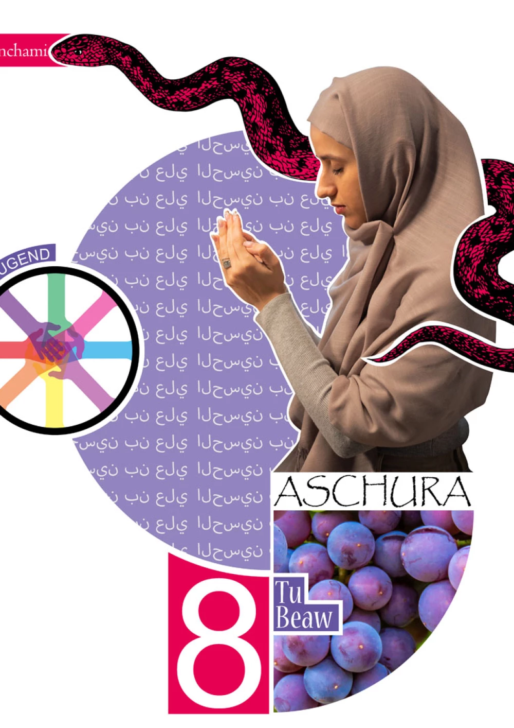 Der klare Aufbau in rechteckige Segmente verleiht diesem Entwurf Ruhe und Stabilität. Die einzelnen Segmente sollen mit ihren Grafiken unterschiedliche Kulturen widerspiegeln und eine bunte und vielfältige Gesellschaft zeigen. Als Eyecatcher fungiert die freigestellte Schlange welche in Verbindung mit vielen Feiertagen steht. Diese fällt durch ihre freie Form und Farbigkeit auf.