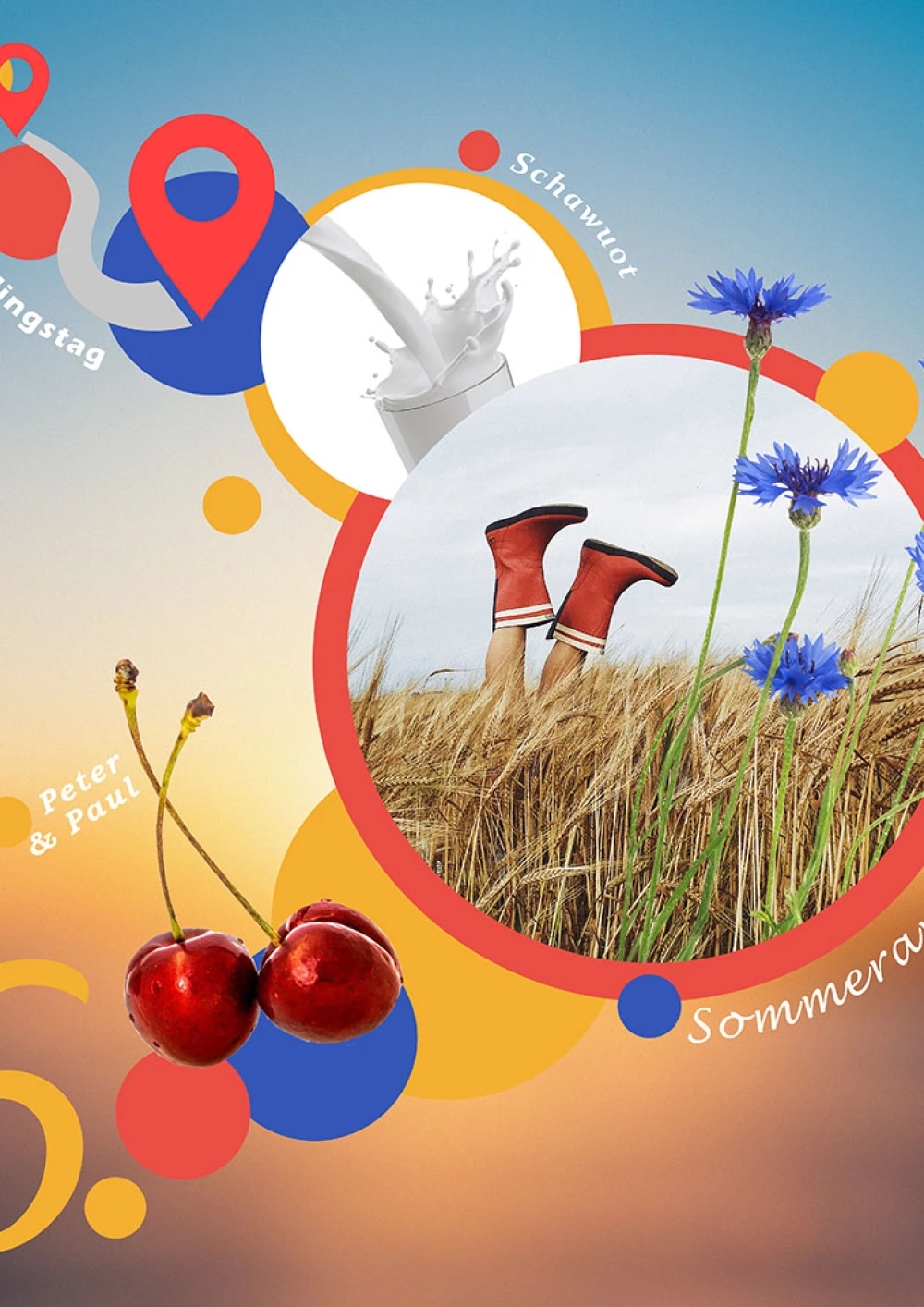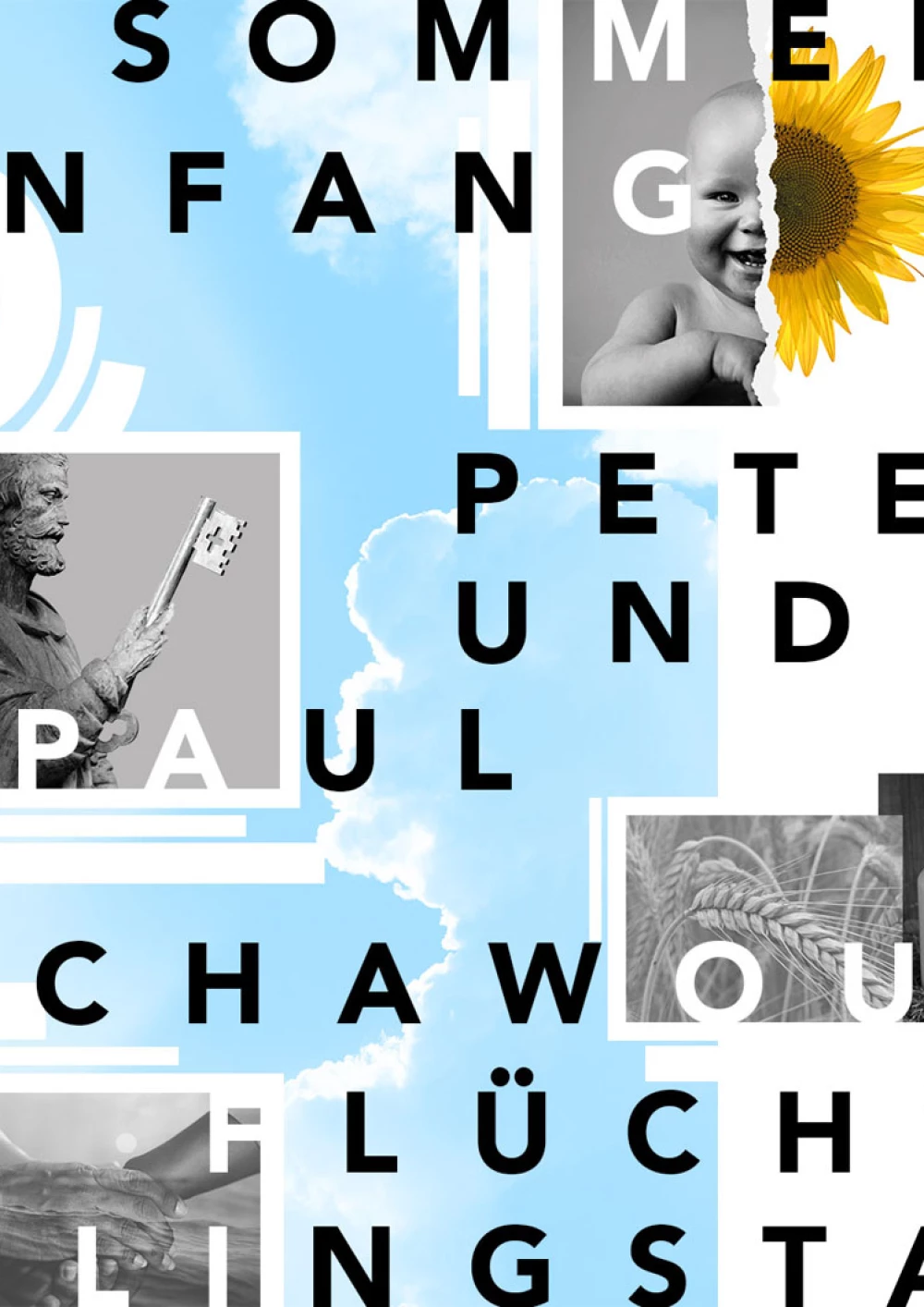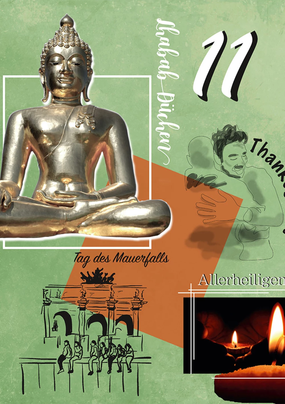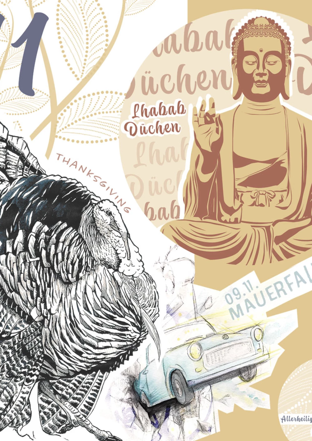 Die Aufgabenstellung war eine Gestaltung der Feiertage Lhabab Düchen, Thanks Giving, Allerheiligen und des 09.11. (Tag des Mauerfalls) im Flat Design angelehnt an ein Moodboard. Alle Elemente sind mit einem weißen Rand versehen, der einen lockeren Eindruck vermitteln soll, als lägen ausgeschnittene Ideen auf dem Untergrund. Lhabab Düchen wird dargestellt durch eine Vektorgrafik des Buddhas eingerahmt in einem Kreis der nicht nur als Gestaltungselement dient, sondern auch die Figur als Gottheit strahlen lässt. Der Feiertag existiert zu Freuden der Rückkehr Buddhas aus dem Götterhimmel, das Element befindet sich oben rechts, damit es wirkt wie ein sich langsam senkender, fallender Kreis. Thanks Giving, einer der Wichtigsten Amerikanischen Feiertage wird traditionell mit einem Truthahnbraten gefeiert, es wird vom Präsidenten aber auch jedes Jahr ein Truthahn begnadigt, deshalb habe ich eine Tuschezeichnung eines solchen Vogels skizziert und ausgearbeitet. Die unterschiedlichen Federstrukturen des Vogels Geben einenInteressanten Kontrast zum Rest der Elemente. Der Mauerfall am 09.11. Wird in der Anordnung mit einem Aquarell eines Trabant dargestellt, in Anlehnung an eines der Kunstwerke auf der Berliner Mauer (Trabant bricht durch die Mauer, Birgit Kinder). Das Fahrzeug bricht durch ein Mauersegment und bringt als bewegtes Objekt Dynamik in die sonst eher statische Komposition. Wobei der Aquarellstil einen weiteren Kontrast ins Gesamtbild einbringt. Allerheiligen ist ein Feiertag an dem es darum geht den Heiligen zu gedenken. Er ist eng verknüpft mit Allerseelen (an diesem Tag gedenkt man den Toten in der eigenen Familie) Gräber werden besonders geschmückt, ein gesonderter Gottesdienst wird gehalten. Man soll sich seiner eigenen Sterblichkeit bewusst werden, um ein gutes Leben zu führen. Das freigestellte Element der Laterne mit dem Symbol der Kreuzes strahlt Hoffnung aus und ist ein minimalistisches Symbol das für beide Feiertage einstehen kann.