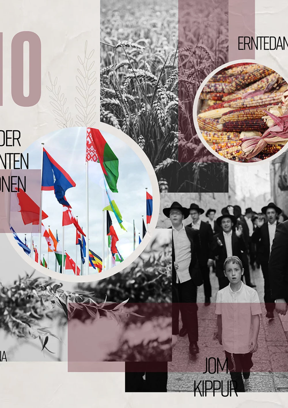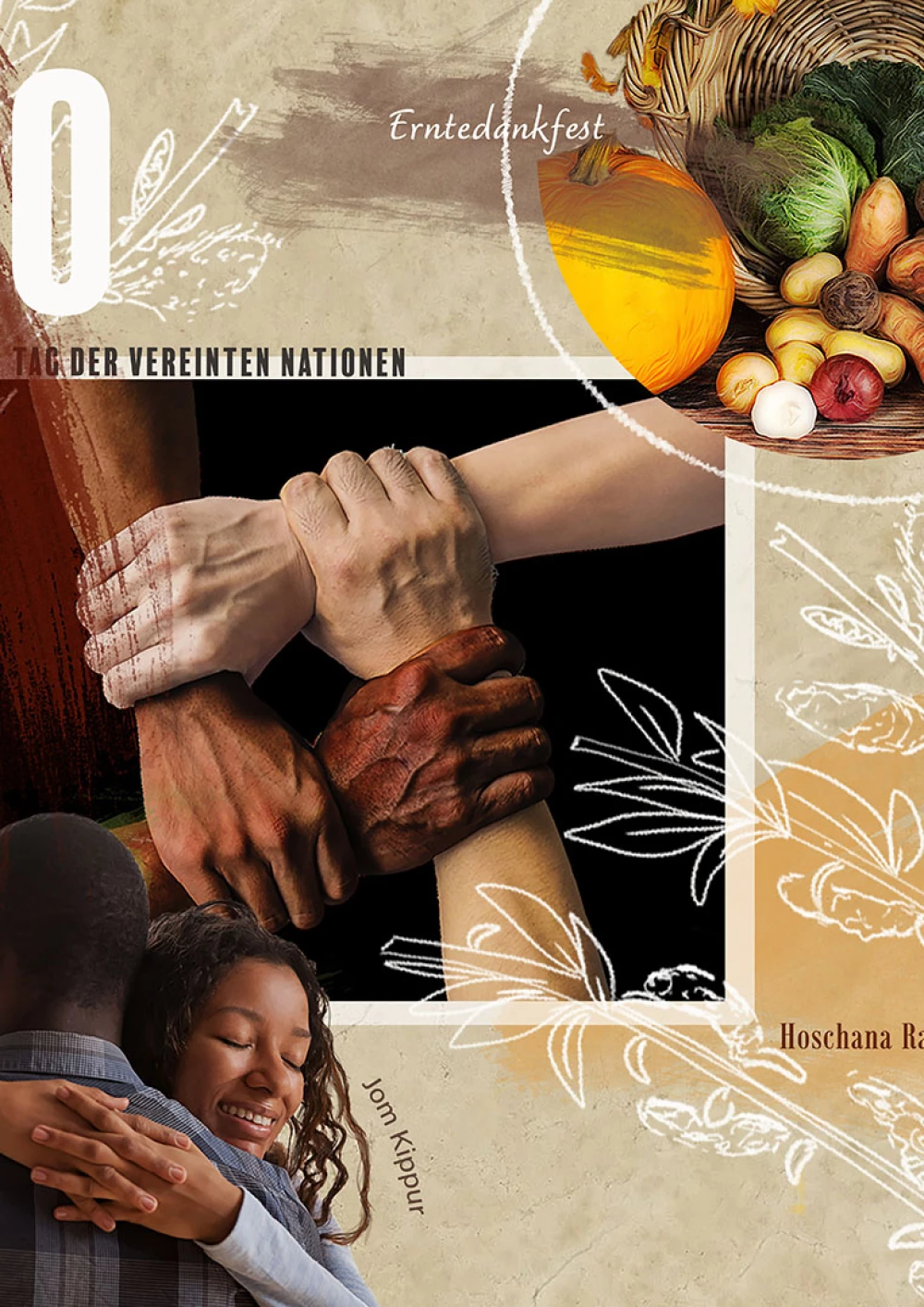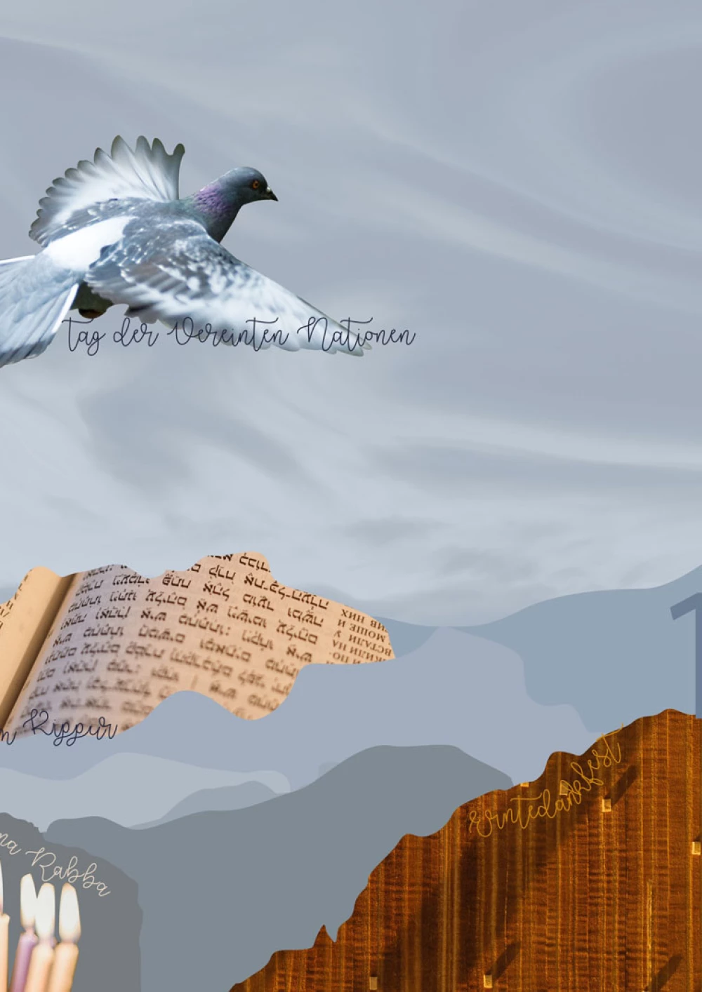 Mit einer aufstrebenden Anordnung werden die Motive für den Kalendermonat stimmig in Szene gesetzt und unterstützen dabei den Fokus auf den in diesem Monat stehenden Gedenktag. Für den Monat Oktober stand neben den Festen Jom Kippur, Hoschana Rabba, Erntedank, der Gedenktag “der Tag der vereinten Nationen” im Mittelpunkt des Kalenderblatts. Dieser Gedenktag wird durch eine vertikale Fläche und eine runde Umfassung in den Fokus der Komposition gerückt. Die weiteren Feste staffeln sich hier am Bildrand. Die einzelnen Elemente habe ich in unterschiedlichster Form und unabhängig voneinander kreiert und erarbeitet. Dabei ging eine intensive Auseinandersetzung der einzelnen Religionen und Kulturen voraus. Bei der Bearbeitung der Elemente habe ich versucht eine ausgewogene Mischung aus Fotografischen aber auch händisch produzierten Elementen zu finden. Das Zusammenwirken der einzelnen Elemente bestimmte für mich den Verlauf meiner Arbeit und führte mich zu mehreren Umsetzungen.