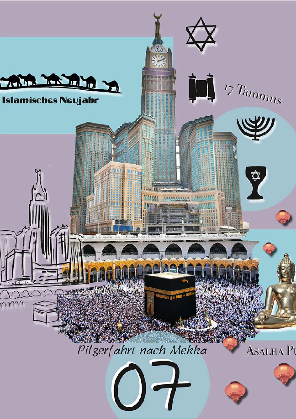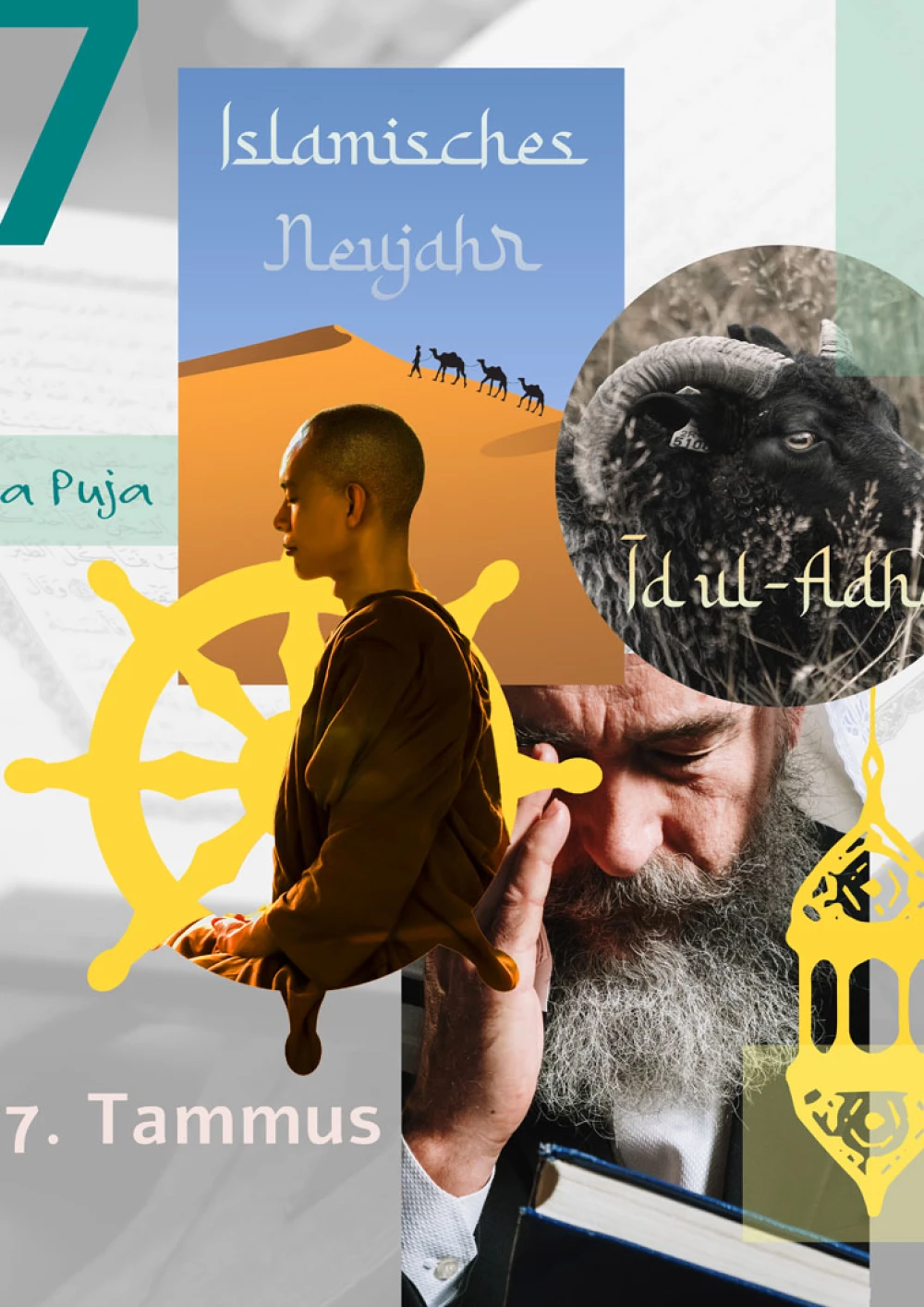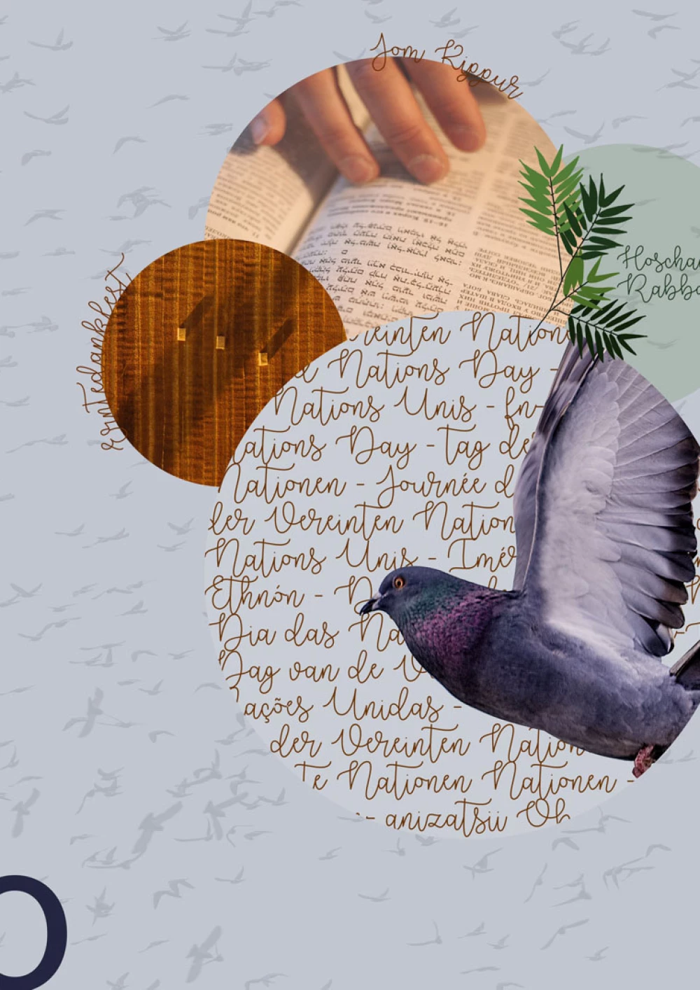 Mit einer aufstrebenden Anordnung werden die Motive für den Kalendermonat stimmig in Szene gesetzt und unterstützen dabei den Fokus auf den in diesem Monat stehenden Gedenktag. Für den Monat Oktober stand neben den Festen Jom Kippur, Hoschana Rabba, Erntedank, der Gedenktag “der Tag der vereinten Nationen” im Mittelpunkt des Kalenderblatts. Dieser Gedenktag wird durch eine vertikale Fläche und eine runde Umfassung in den Fokus der Komposition gerückt. Die weiteren Feste staffeln sich hier am Bildrand. Die einzelnen Elemente habe ich in unterschiedlichster Form und unabhängig voneinander kreiert und erarbeitet. Dabei ging eine intensive Auseinandersetzung der einzelnen Religionen und Kulturen voraus. Bei der Bearbeitung der Elemente habe ich versucht eine ausgewogene Mischung aus Fotografischen aber auch händisch produzierten Elementen zu finden. Das Zusammenwirken der einzelnen Elemente bestimmte für mich den Verlauf meiner Arbeit und führte mich zu mehreren Umsetzungen.