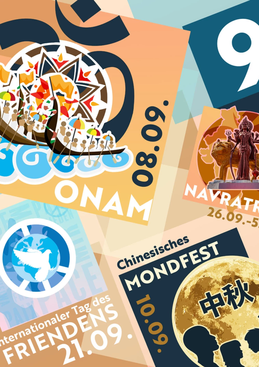 Der Fokus bei der Gestaltung liegt auf dem Fest „Onam“, welches aus dem Hinduismus stammt und unserem Erntedankfest ähnelt. Das Fest vereint eine Vielzahl von Farben und Aromen, sämtliche Häuser werden mit prächtigen Blumenteppichen geschmückt. Das chinesische Mondfest, eines der wichtigsten Feste im Buddhismus. Der Mond symbolisiert mit seiner Rundung Ganzheit und Zusammengehörigkeit und wird immer, wenn der Mond voll ist, gefeiert. Der Mooncake (Mondkuchen) ist das absolute Muss und das wichtigste traditionelle Gebäck am Mondfest. Der Internationale Friedenstag wird seit der UN-Generalversammlung 1981 als Weltfriedenstag (International Day ofPeace) gefeiert und die Idee des Friedens, sowohl innerhalb der Länder und Völker als auch zwischen ihnen, zu stärken. Mit dem Fest Navaratri ehren Hindus ihre Göttinnen. Der Name bedeutet Neun Nächte, und solange dauert das Fest auch. Im nordindischen Bengalen und in Nepal hat die Göttin Durga die meisten Verehrer. Die Menschen feiern den Sieg der Durga über den Dämonen Mahishasura.