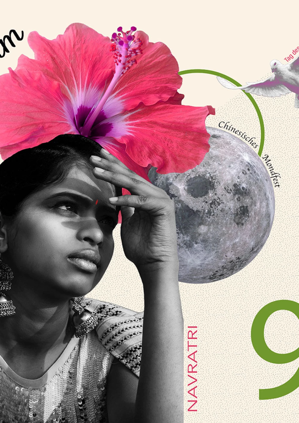 Im Fokus der Komposition liegt klar und farblich schön hervorgehoben eine Hibiskusblüte. Sie wird traditionell für die Erstellung von runden Blumenkränzen (sog. Pookalams) während dem Onam Fest in Indien verwendet. Symbolisch für das Fest sind außerdem krachige Orange-, Grün-, und Rosatöne; die in der Komposition aufgegriffen werden. Dargestellt wird zudem in Form einer Friedenstaube der internationale Tag des Friedens. Die Taube ist farblich an das Konzept angepasst und wirkt als würde sie das intensive Rosa der Blume reflektieren. Die Weiteren beiden Symbole wurden bewusst schwarz-weiß gehalten, um dem Hauptfeiertag keine Aufmerksamkeit zu nehmen. Im Falle der nachdenklichen Frau verleiht die Farbwahl dem Bild sogar noch mehr Ausdrucksstärke. Sie steht für Navratri, einem hinduistischen Fest, bei dem die weiblichen Göttinnen geehrt werden. Der Mond steht für das chinesische Mondfest und rundet die Komposition ab.