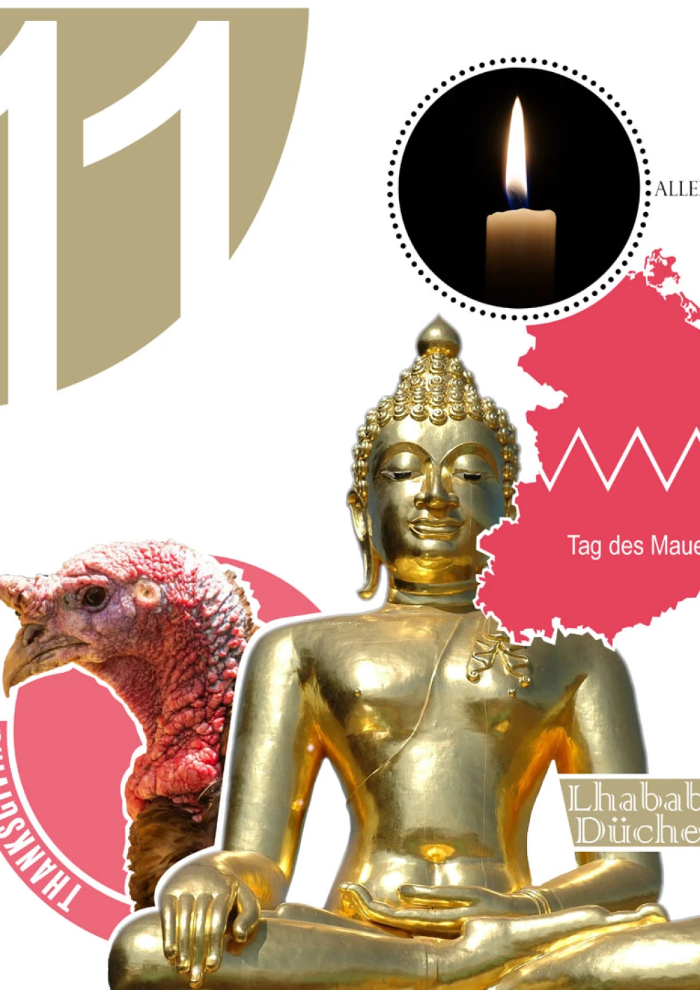 Lhabab Düchen ist ein Buddhistischer Feiertag, es wird die Rückkehr Buddhas aus dem Götterreich gefeiert und alle Aktionen werden 100 Millionen Mal multipliziert positiv wie negativ. Dieser Feiertag wird bildlich als großer Buddha in der Abbildung dargestellt. Tag des Mauerfalls ist ein Gedenktag an den 10.11.1989 den Tag des Falls der Berliner Mauer. Hierfür dient die Grafik der Zerschnittenen DDR. Allerheiligen ist ein Christlicher Gedenktag. Die Katholiken gedenken allen Heilligen, also allen die den Glauben gelebt und verteidigt haben. Für das Fest wurde die Kerze als Bild ausgewählt. Thanksgiving ist das US-Amerikanische Erntedankfest, Das wichtigste Familien Fest in den Vereinigten Staaten im Mittelpunkt steht eine große Mahlzeit. Die ist traditionell ein Truthahn, weswegen die Abbildung eines Truthahnes für dieses Fest.