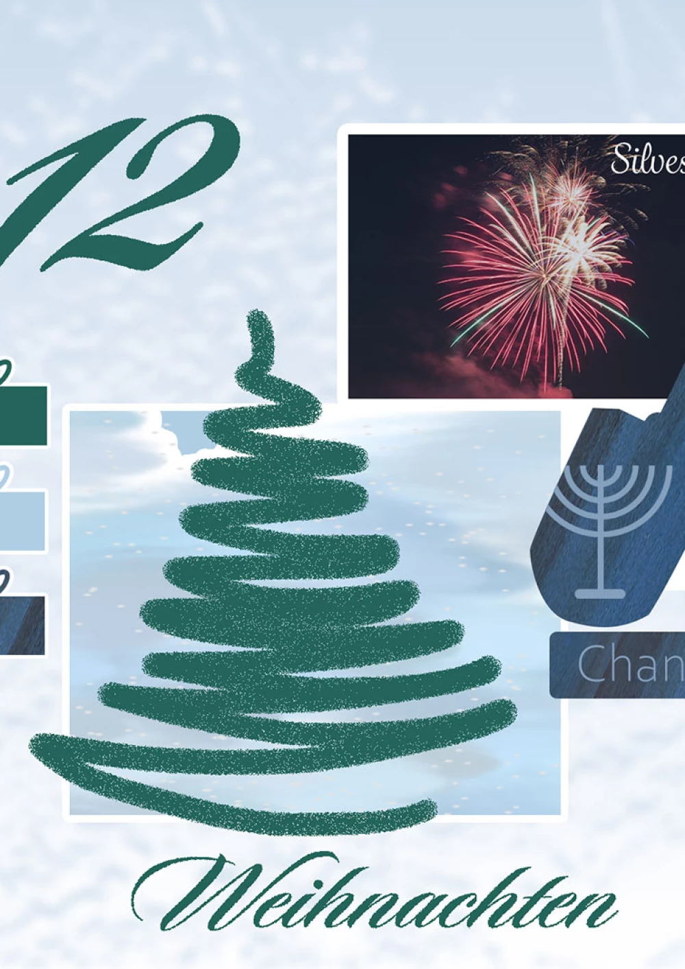 Die Aufgabenstellung war eine Gestaltung der Feiertage Chanukkah, Silvester und Weihnachten. Die Elemente sind im Flat Design gestaltet und fügen sich aus Rundungen und harten, rechteckigen Formen zusammen. Weihnachten wird hier durch das freigestellte Rentier in Kombination mit dem rustikalen Hintergrund mit klassischer Weihnachtsdekoration eingebracht und hervorgehoben. Das Rentier-Element dominiert die Komposition und rahmt alle anderen Elemente ein. Insgesamt war es mein Ziel, Weihnachten nicht zu kitschig und überladen darzustellen und den winterlichen Aspekt mehr hervorzuheben. Chanukkah, das Lichterfest, dargestellt durch die wichtigste Requisite: Die Chanukkia. Von allen Elementen die mit diesem Fest in Verbindung stehen, ist dieses das wohl aussagekräftigste. Der 9-armige Kerzenleuchter stellt das Lichterwunder dar welches an Chanukkah gefeiert wird. Oft sind die Kerzen bunt, ich habe allerdings bewusst ein Bild mit weißen Kerzen gewählt um dem Farbschema der Gestaltung treu zu bleiben und den Betrachter nicht mit zu vielen Farben zu überfordern. Silvester, das große Fest am Ende des Jahres habe ich hier reduziert dargestellt. Feuerwerk im kleinsten Kreis quasi, denn das Steigende Umweltbewusstsein der Menschen wird die großen Himmelsschauspiele irgendwann überflüssig machen. Zwei Hände mit Wunderkerzen, ein Jahresabschluss in der Familie oder mit Freunden, mit dem Partner. Das Farbschema des Bildes fügt sich harmonisch ein und wirkt mit dem Kerzenschein des benachbarten Elements ausgeglichen. Das Runde Element ist optisch an die Rundung des Rentiergeweihs angepasst. Durch die Kontur Benachbarten Element mit der Chanukkia entsteht im Silvester Element eine Form, die optisch als Kreis wahrgenommen wird, eigentlich aber keiner ist. (Es greift das Gestaltgesetz der guten Gestalt)als Bild ausgewählt wurde.