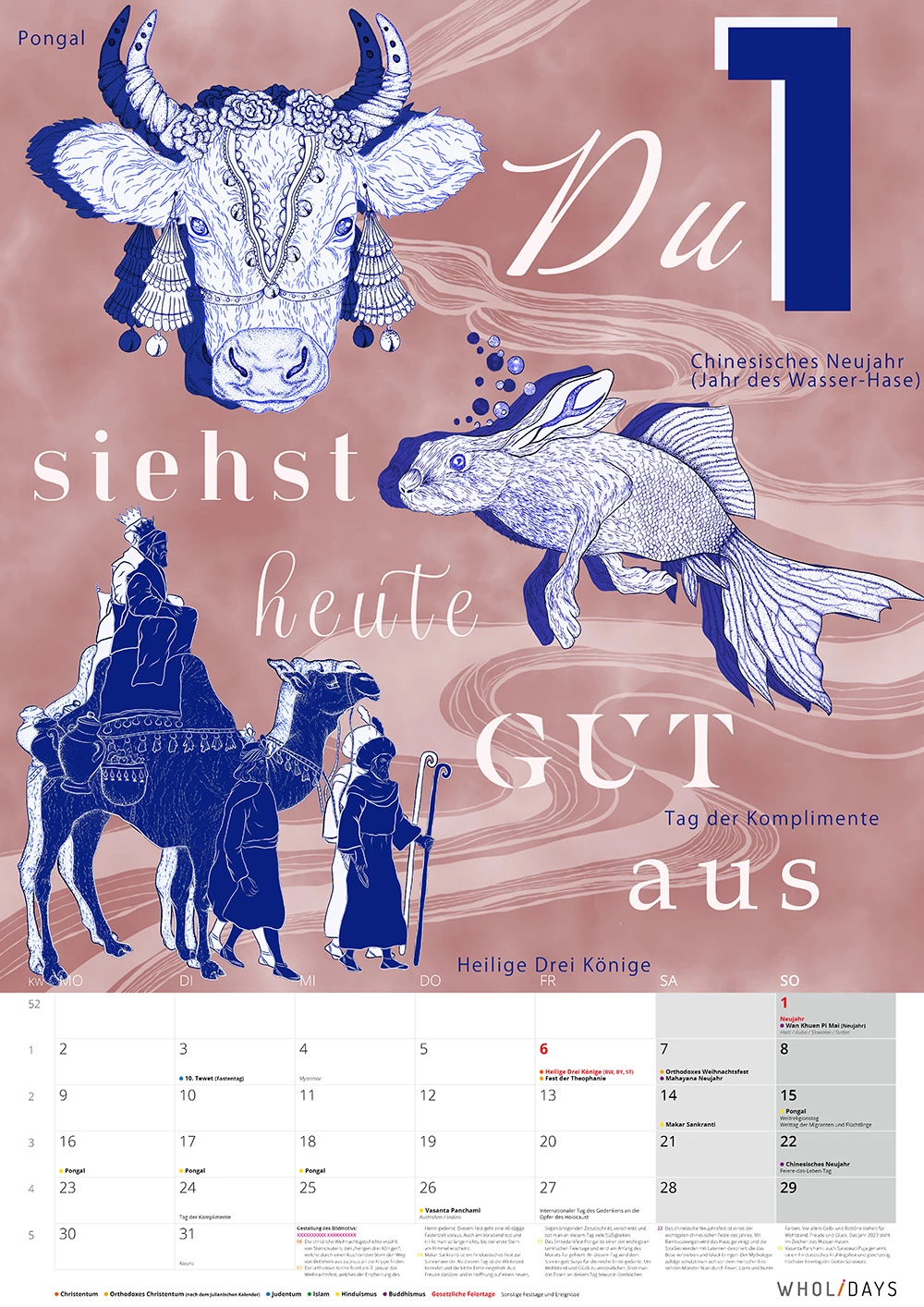 Du siehst heute gut aus! Mit dem Tag der Komplimente, möchte ich das jeder Person, welche sich diesen Kalender im kommenden Jahr an die Wand hängt, täglich mit auf den Weg geben und hoffe es versüßt deren Tag. Die große 1, soll das neue Jahr, die Chance etwas zu verändern, den Neuanfang und die neuen guten Vorsätze andeuten. Farblich sollen die Farben, den tristen Winter etwas mehr zum leuchten bringen. Die restlichen drei Feiertage stehen im Motto der Tiere, ich habe zu jedem folgende Tiere selbst gezeichnet: Chinesisches Neujahr (Jahr des Wasser-Hase), ein Hingucker - Halb Hase Halb Fisch, so stelle ich mir einen „echten“ Wasserhasen vor. Im Hintergrund passend dazu wellenartige Linien. Der gezeichnete, feierlich geschmückte Kuhkopf steht für das indische Erntedankfest Pongal. Das ist auch der Name des Reisgerichts, welches an diesen Feiertagen aus Milch, Reis, Sirup und Palmzucker der neuen Ernte gekocht wird. Der dargestellte Kuhkopf geht aus folgender Erzählung hervor: Gott Shiva hatte während Pongal seinen Bullen Nandi auf die Erde geschickt, um den Menschen die Botschaft zu überbringen: Sie sollen täglich ein Bad und eine Öl Massage nehmen, aber nur einmal im Monat essen. Nandi verdrehte es allerdings und überbrachte, dass sie täglich essen und nur einmal im Monat Baden sollten. Shiva war so sauer auf den Bullen, dass sie ihn für immer auf die Erde verbannte, um den Menschen bei der Ernte zu helfen. Der christliche Feiertag Heiligen Drei Könige (Weise aus dem Morgenland). Gezeichnet mit einem Kamel, welches Ihre Gaben trägt, auf dem Weg zu Jesus. Zu dem sie durch den Stern von Betlehem geführt wurden.