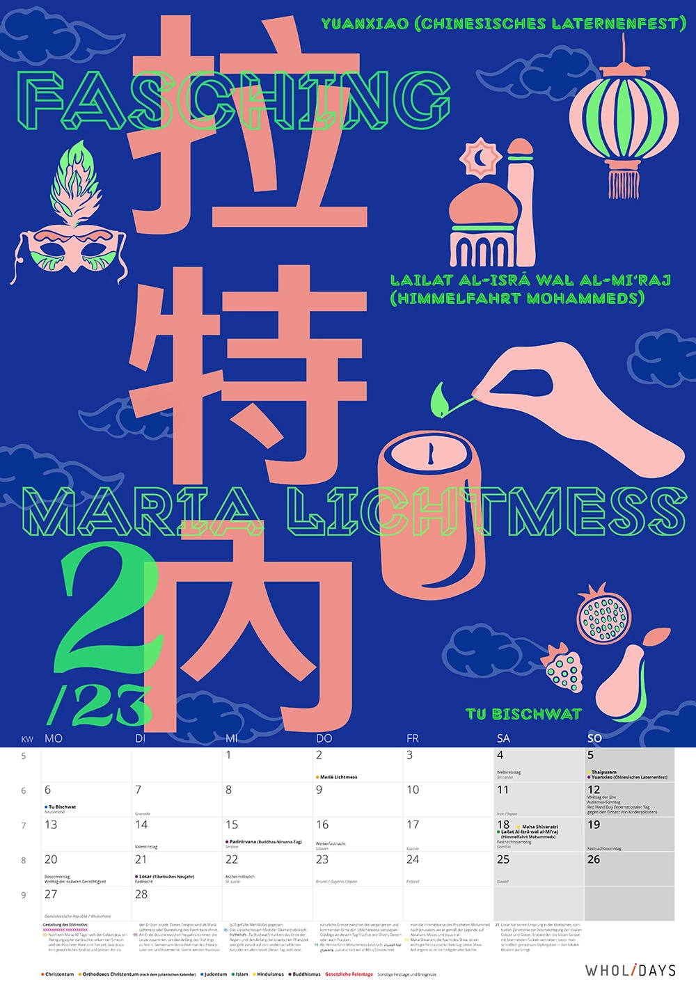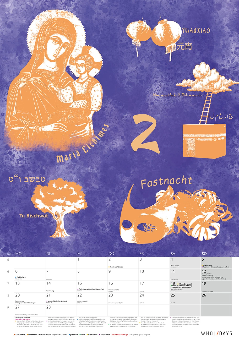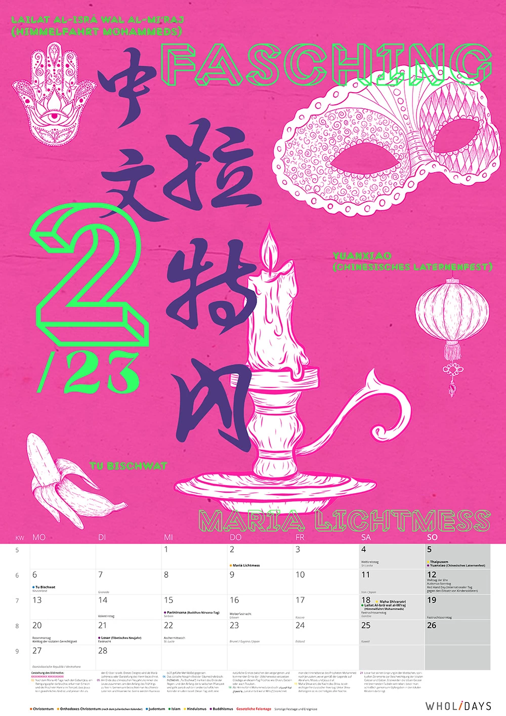 Die Motive des diesjährigen Wholidays Kalender stehen unter dem Motto Risographie/ Zweifarbigkeit. Für den Monat Februar wurden die Feiertage Mariä Lichtmess, Fastnacht, Tu Bischwat (jüdisches Neujahrsfest der Bäume), Yanxiao (Chinesisches Laternenfest) und die Himmelfahrt Mohameds ausgewählt. Um das Fest Mariä Lichtmess, auch Darstellung des Herren genannt, zu verbildlichen, entschied ich mich, eine Ikonografie von Maria mit dem Jesus Kind zu verwenden. Das katholische Fest erinnert an das Reinigungsopfer Marias 40 Tage nach Jesu Geburt. Für das chinesische Laternenfest war schnell klar, dass Lampions das Fest darstellen sollten. Yuanxiao befindet sich am Ende des chinesischen Neujahrs. Die Leute feiern mit Lampions und Feuerwerk den Beginn des Frühlings. Das jüdische Neujahrsfest der Bäume, Tu Bischwat, wird durch einen Baum repräsentiert, da an diesem Tag von gläubigen Bäume gepflanzt werden. Der Feiertag markiert das Ende der Regen und den Anfang der israelischen Pflanzzeit und geht zurück auf den landwirtschaftlichen Kalender im alten Israel. Da bunte Masken und Luftschlangen bei keiner Fastnacht fehlen dürfen, habe ich mich genau für diese Motive entschieden. Luftschlangen und Maske habe ich einzeln fotografiert und dann zusammengefügt. Das Motiv zur Himmelfahrt Mohammeds besteht aus den Elementen Kaaba, Leiter und Wolke. Meine Collage spielt auf die Himmelfahrt (Miʿrādsch) an, bei der mohammed mit einer Leiter in den Himmel hinauf gestiegen ist. Die Fonts sind an das jweilige Fest angelehnt und teilweise in der Schrift der zugehörigen Kultur geschrieben.
