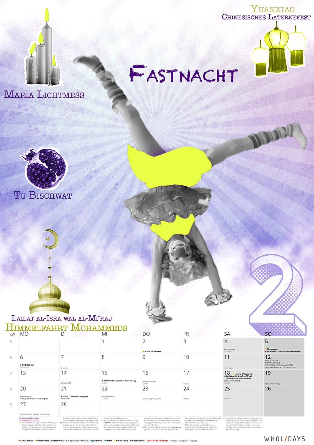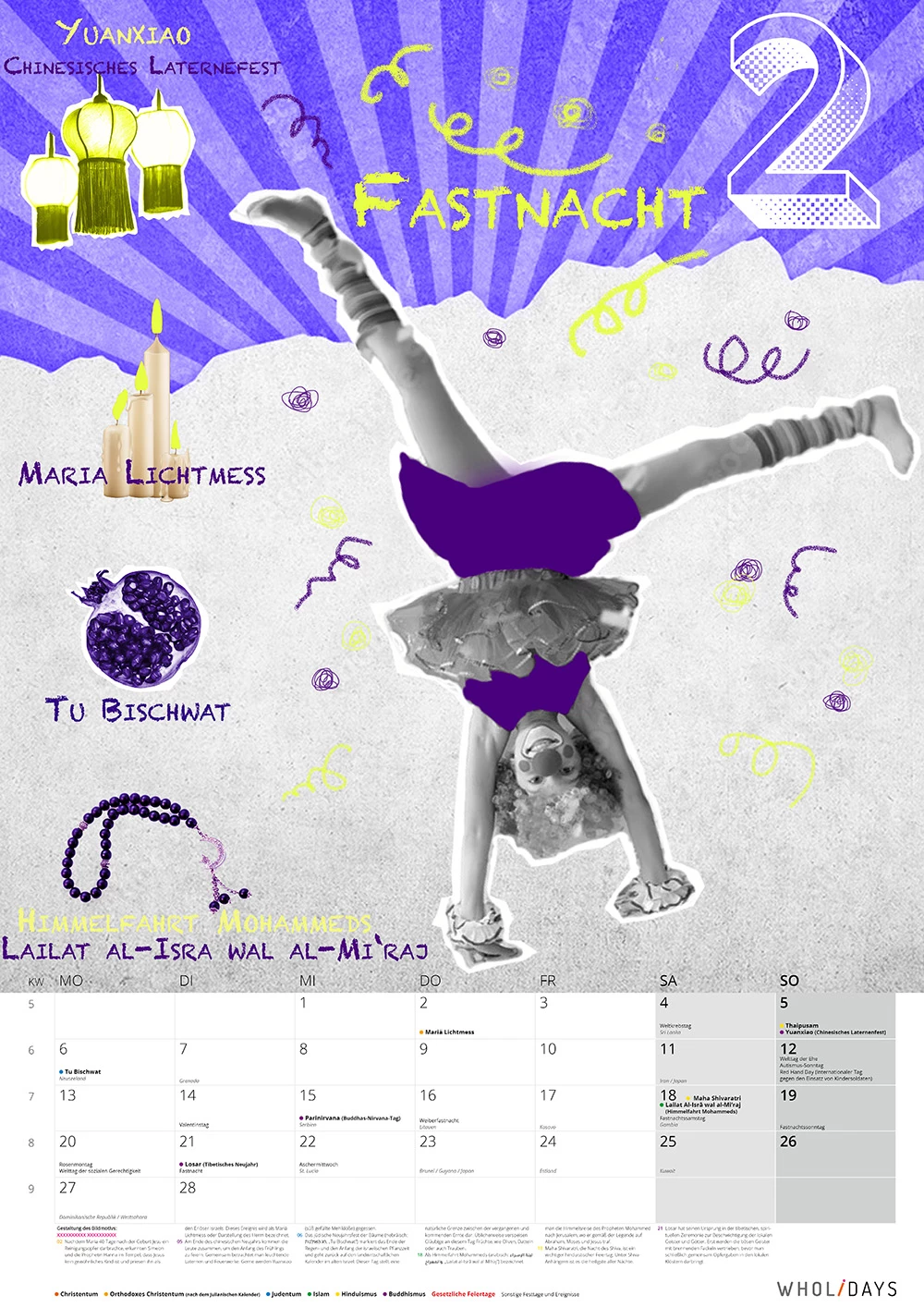 Im Februar steht der Fasching im Mittelpunkt, aus diesem Grund wurde die maskierte Frau in den Fokus gebracht. Um ein rundes Gesamtkonzept zu gestalten, wurden Elemente aus den anderen Festen gesucht, welche alle in Summe hierzu harmonieren: - Yuanxiao (chinesisches Laternenfest): typisch chinesische Laternen / - Tu Bischwat: Olivenzweig, welcher zu den sieben heiligen Früchten zählt / - Valentinstag: Amor, der als Knabe mit Flügeln dargestellt wurde. Für den Hintergrund wurde eine warme Farbe ausgewählt, welche die Fröhlichkeit des Kalenderblattes widerspiegelt. Da Fasching zu den Frühlingsfesten zählt und die bösen Geister vertreiben soll, mit dem Laternenfest der Anfang des Frühlings gefeiert wird, Tu Bischwat für das Neujahr der Bäume steht und der Valentinstag dafür sorgen soll, dass die Liebe wächst, wurde, um deutliche Akzente zu setzen, ein kräftiges Grün ausgewählt, da es für die Fruchtbarkeit und alles was wächst und gedeiht, steht.