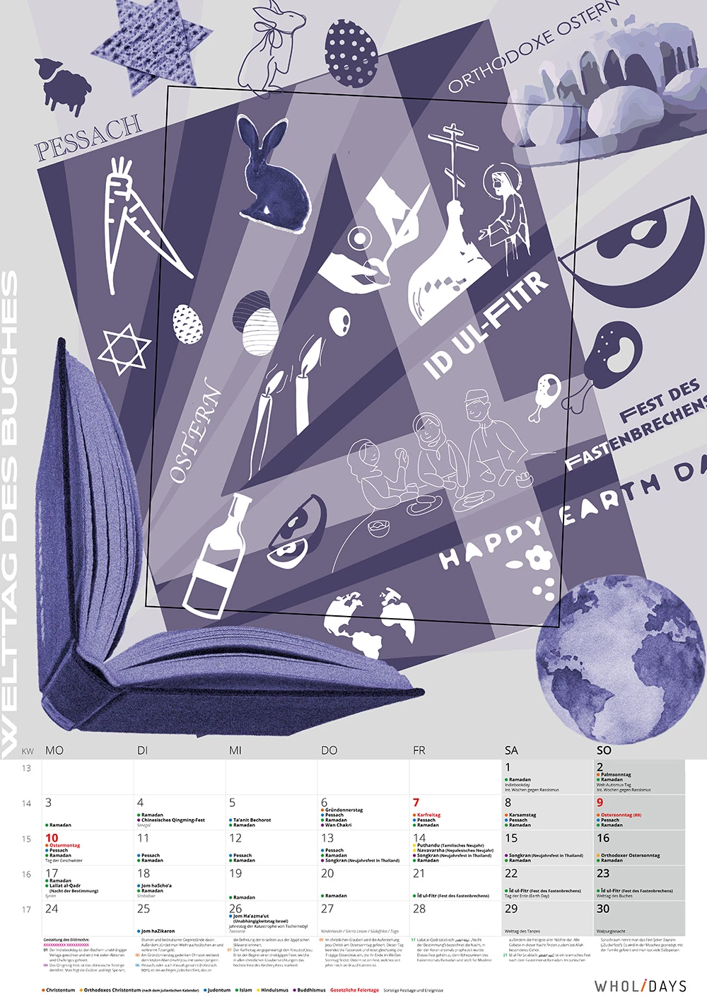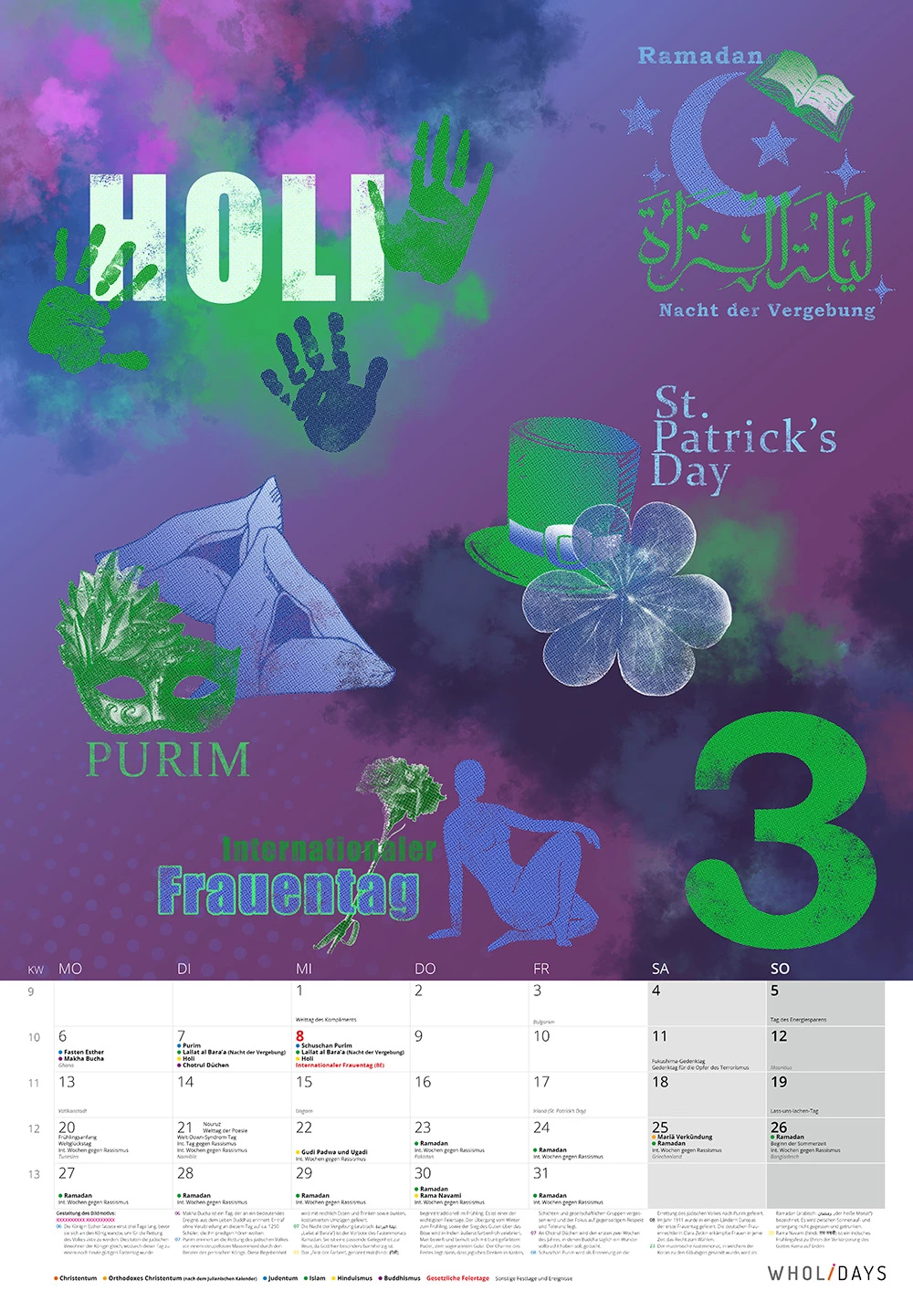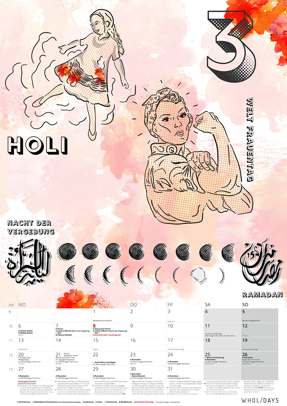 Im Fokus diesen Monats steht das hinduistische Frühlingsfest „Holi“, oder auch „Fest der Farben“ genannt. Aus diesem Grund ist der dazugehörige Schriftzug der größte und das Konzept von abstrakten „Farbklecksen“ im Hintergrund breitet sich auf das gesamte Kalenderblatt aus. Das muslimische Fest „Lailat al Bara´a“: die sogenannte Nacht der Vergebung und der Beginn des Fastenmonats Ramadan spielen ebenfalls eine große Rolle. Diese Feiertage hängen mit dem islamischen Mondkalender zusammen - am Vollmond des Monats wird Lailat al Bara´a gefeiert und nach dem darauf folgenen Neumond, nachdem wieder die erste Mondsichel zu sehen ist, beginnt Ramadan. Aus diesem Grund werden diese Feste mit den passenden Mondphasen verbunden und es entsteht eine Einheit. Die Illustration zum Welttag der Frauen ist eine Anlehnung an das Poster „We can do it!“ von J. Howard Miller - inzwischen ein ikonisches Symbol für den Feminismus.