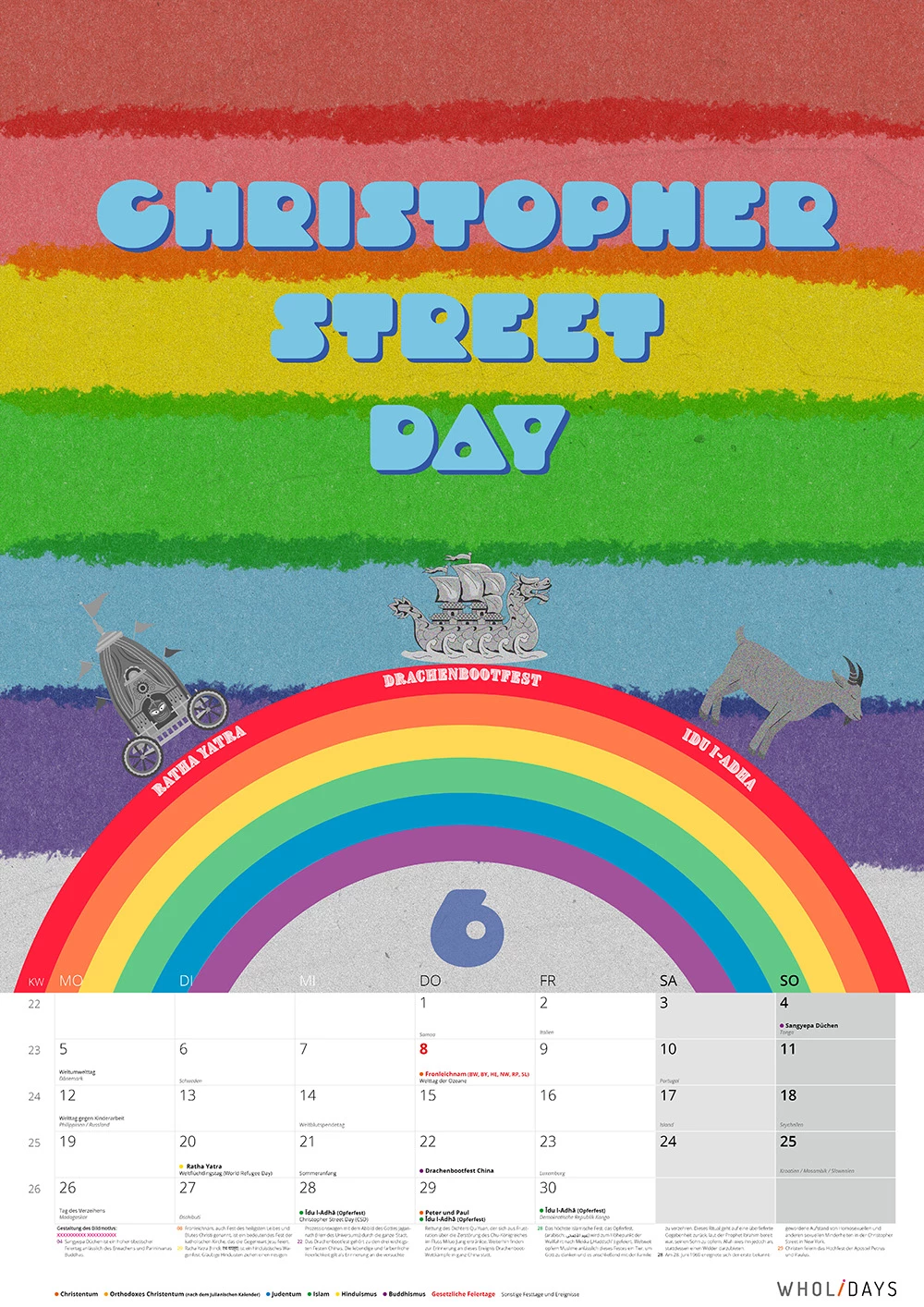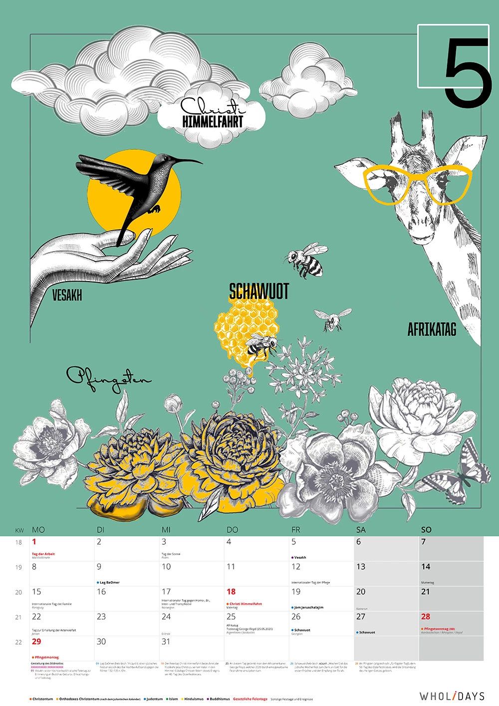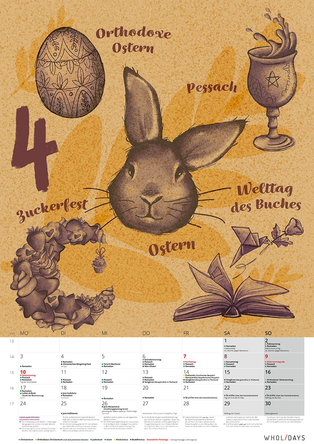 Im Fokus diesen Monats steht das hinduistische Frühlingsfest „Holi“, oder auch „Fest der Farben“ genannt. Aus diesem Grund ist der dazugehörige Schriftzug der größte und das Konzept von abstrakten „Farbklecksen“ im Hintergrund breitet sich auf das gesamte Kalenderblatt aus. Das muslimische Fest „Lailat al Bara´a“: die sogenannte Nacht der Vergebung und der Beginn des Fastenmonats Ramadan spielen ebenfalls eine große Rolle. Diese Feiertage hängen mit dem islamischen Mondkalender zusammen - am Vollmond des Monats wird Lailat al Bara´a gefeiert und nach dem darauf folgenen Neumond, nachdem wieder die erste Mondsichel zu sehen ist, beginnt Ramadan. Aus diesem Grund werden diese Feste mit den passenden Mondphasen verbunden und es entsteht eine Einheit. Die Illustration zum Welttag der Frauen ist eine Anlehnung an das Poster „We can do it!“ von J. Howard Miller - inzwischen ein ikonisches Symbol für den Feminismus.
