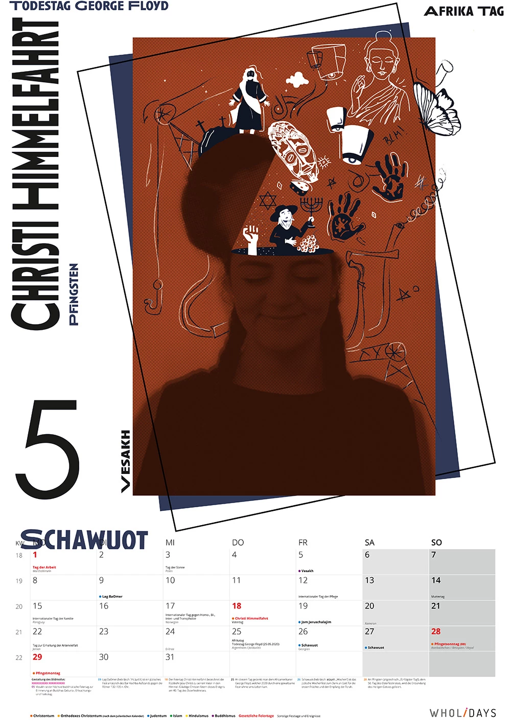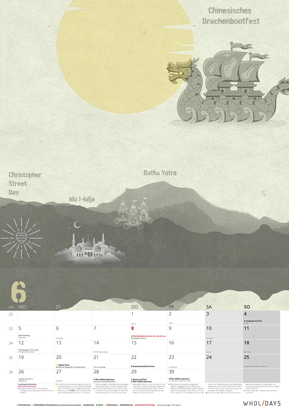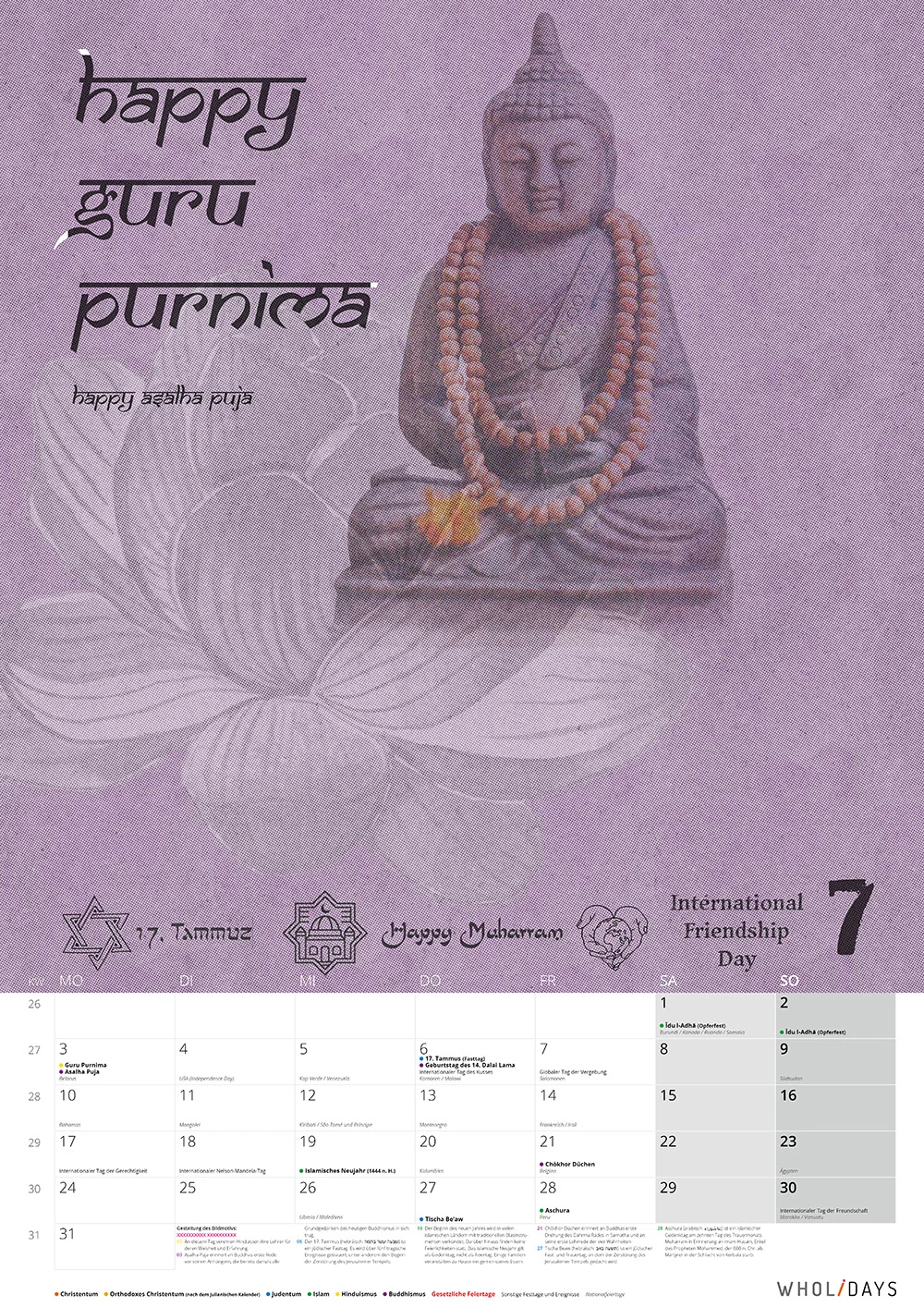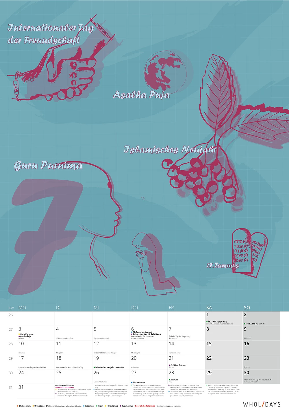 Das stilistisch geordnete Layout für den Monat Juli verkörpert fünf Feste anhand von fünf Motiven. Das hinduistische Fest „Guru Purnima“ ist mit der Monatszahl vereint und erinnert an die traditionelle Ehrung des spirituellen Lehrers. Bei dem jüdischen Fest „17. Tammus“ werden insgesamt fünf Ereignisse gefeiert. Eines von ihnen die ist Entzweiung der Gebotstafeln durch Moses. Der schattierte Mehlbeerenast steht für das „Islamische Neujahr“ und ist eines der vielen traditionellen Lebensmittel, die an an diesem Festtag verspeist werden. Das Buddhistische Fest „Asalha Puja“ beginnt an einem Tag des Vollmonds, weswegen ein Vollmond abgebildet ist. Die Freundschaftsbänder an den Handgelenken der schüttelnden Hände verkörpern den internationalen Tag der Freundschaft. Das Raster im Hintergrund beruhigt die größenunterschiedliche Anordnung der Motive.