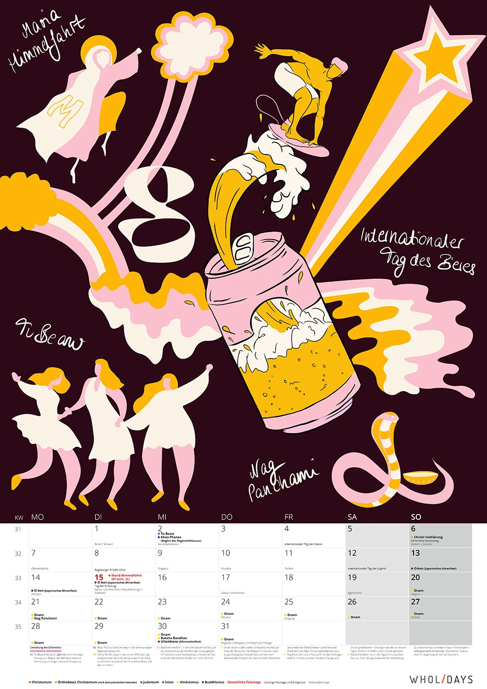 August ist der Sommermonat schlechthin. Im Fokus soll der Internationale Tag des Bieres stehen. Wann schmeckt kühles Bier besser als bei warmen Temperaturen - um dieses Sommergefühl noch mehr zu verstärken, habe ich einen Surfer reitend auf der „Bier-Welle“ illustriert. Welche einen dynamischen Schwung in das Blatt bringt. Um diesen sommerlichen Schwung weiter zu unterstreichen habe ich Formen in cremiger Farbgebung, die zerschmolzene Eiscreme andeuten, eingebaut. Auch die Bezeichnung der Feste in Handschrift soll an selbst beschriftete Tafeln in Biergärten erinnern. Bei Mariä Himmelfahrt habe ich mich gegen eine strenge christliche Abbildung entschieden, sondern sie passend zum Rest des Bildes modern dargestellt. Sie soll, mit dem Umhang auf dem ein großes M für Mariä steht, an eine Superheldin, die in den Himmel fliegt anspielen. Die drei illustrierten, tanzenden Mädchen symbolisieren den jüdischen Feiertag Tu Beaw. An diesem Tag tanzen Mädchen in weißen Kleider in den Weinbergen, um so von ihren zukünftigen Ehemännern ausgewählt zu werden. Die Cobra stellt den Feiertag Nag Panchami (Hinduistisch, Jains, Buddhismus) dar. Hier wird die Schlange bzw. Kobra (Nagas) verehrt. Man stellt den Schlangen Schalen gefüllt mit Milch oder Früchten raus.