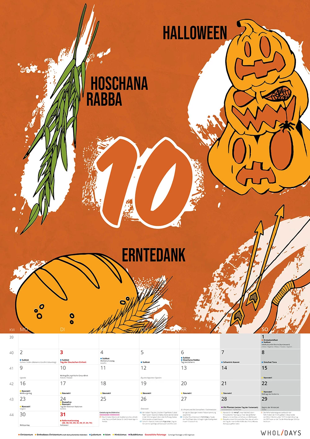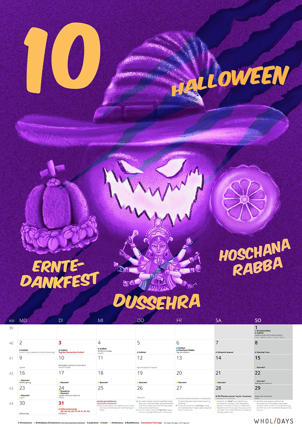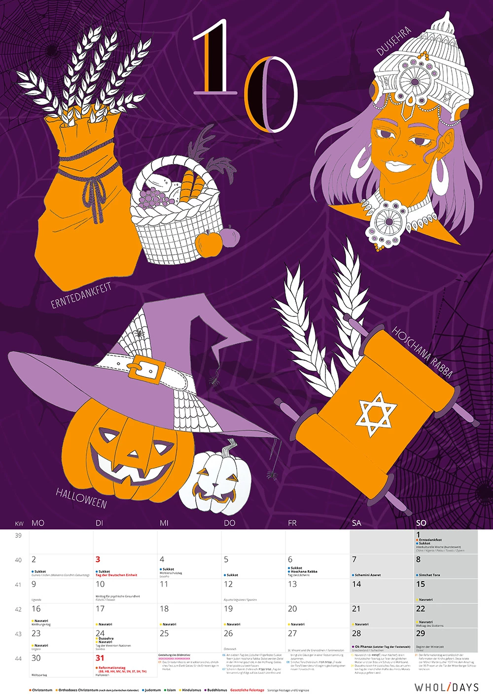 Der Hintergrund ist passend zum Symbol Halloween gefüllt mit Spinnenweben und Ketten, welche das Motiv etwas gespenstisch wirken lassen sollen. Auf der für den Monat Oktober stehenden Nummer 10 sind diese Spinnenweben auch zu sehen. Die Farbe des Hintergrundes ist inspiriert durch den Herbst und ist an seine sich in rot, beziehungsweise orange, färbene Blätter in den Bäumen angelehnt. Die blau Farbe entstand durch das Motiv für das hinduistische Fest Dussehra, an welchem der Sieg des häufig mit blauer Haut dargestellten Gott Raman über den Dämonenkönig Ravana gefeiert wird. Desweiteren wird der Davidstern, der hier auf der Tora für den jüdischen Feiertag Hoschana Rabba zu sehen ist, auch meist durch eine dunkelblaue Farbe dargestellt. Die Flecke hinter den Zeichnungen sollen nicht nur diese hervorheben, sondern auch auf den Namen des jeweiligen Festes, welcher dort geschrieben steht, hinweisen.