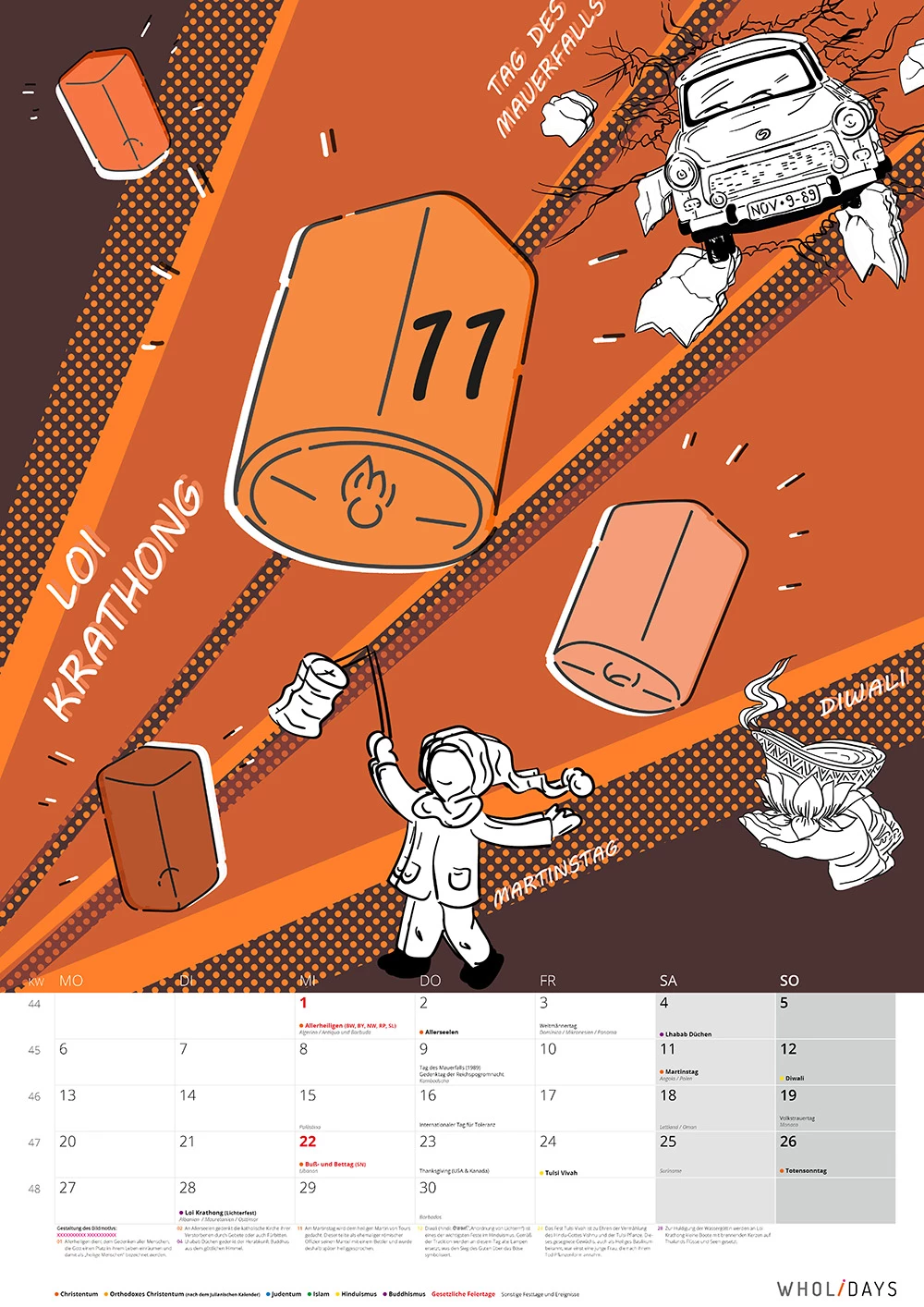 Der trübe und graue Herbstmonat November wird hier durch leuchtende Grafiken erhellt. Die sogenannten schwebenden Fackeln des Lichterfestes „Loi Krathong“ steigen in den Himmel und erleuchten die dunkle Nacht mit ihrem Feuer. Das Brandenburger-Tor in einem lockeren Zeichenstil gezeichnet, erinnert an den Tag des Mauerfalls 1989. Zusammen mit der traditionellen Diwali-Öllampe und der Laterne für den Martinstag wird der November umso mehr erleuchtet.