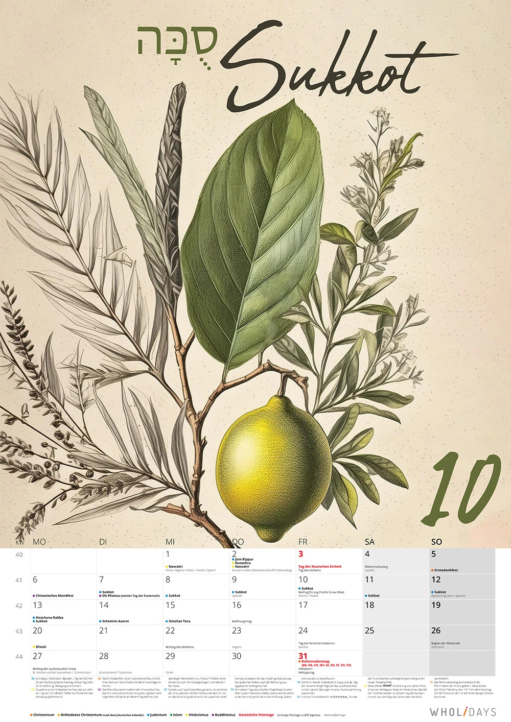Sukkot ist das sogenannte jüdische Laubhüttenfest. Die Hütte ist somit auch im Hintergrund zu sehen, auch wenn sie hier etwas robuster ist. Im Vordergrund sind Früchte und Pflanzen angerichtet, die unterstreichen, dass es sich um das jüdische Erntedankfest handelt.