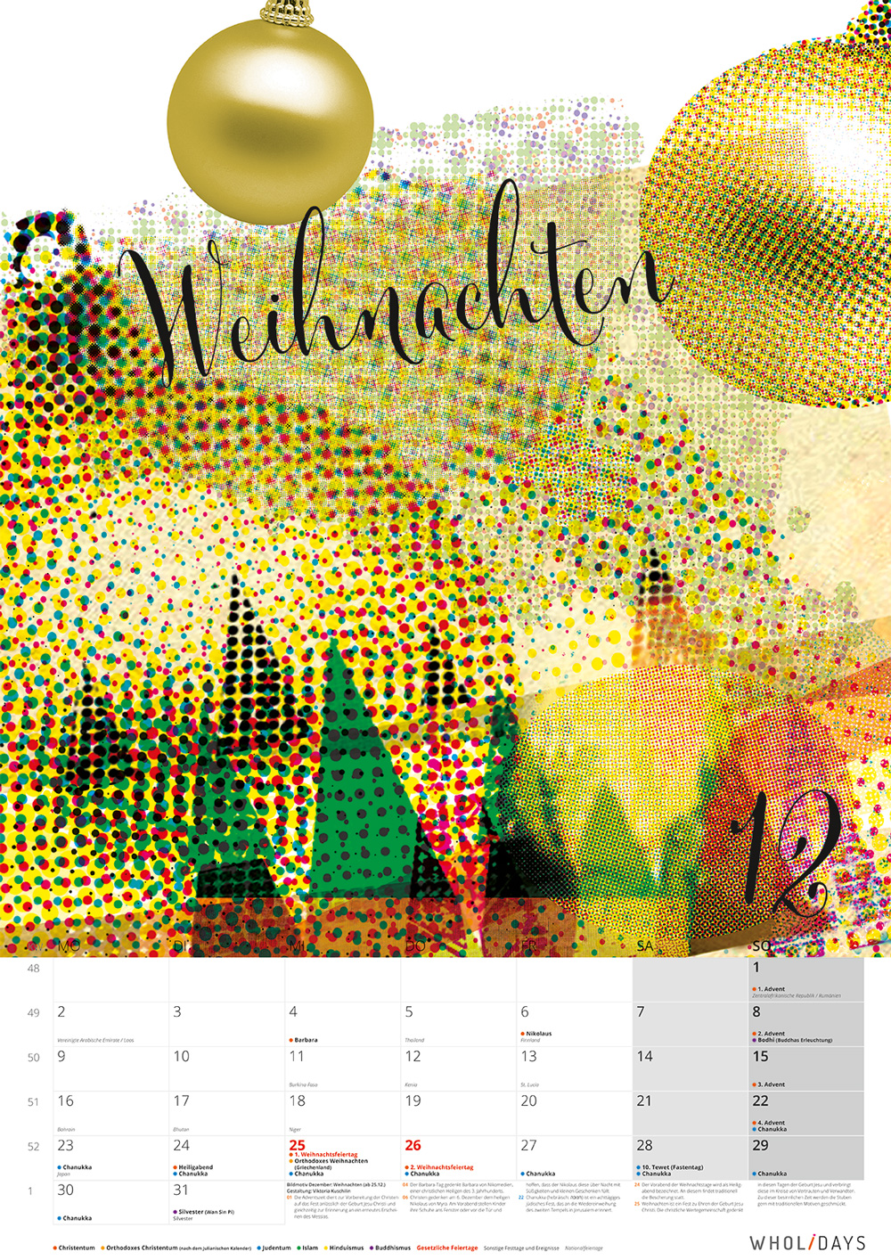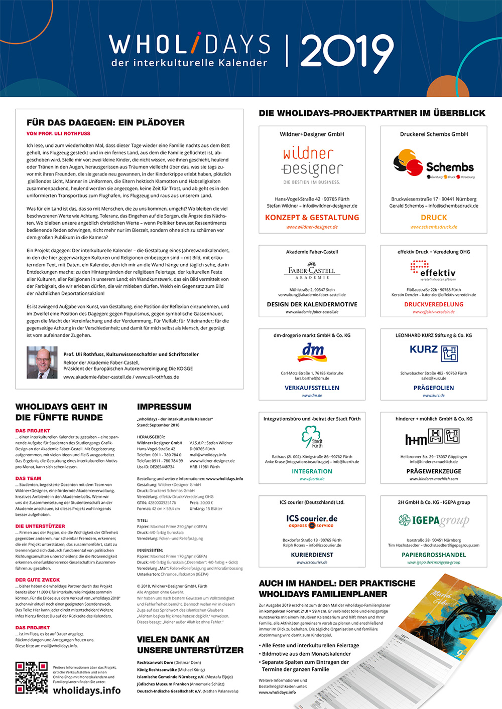 Das intuitive Kalendarium ermöglicht es, eine Vielzahl an Festivitäten mit einem modernen und ansprechenden Layout zu vereinen. wholidays 2019 setzt dabei wie im Vorjahr auf eine Kooperation mit der in Stein b. Nürnberg ansässigen Akademie Faber-Castell.