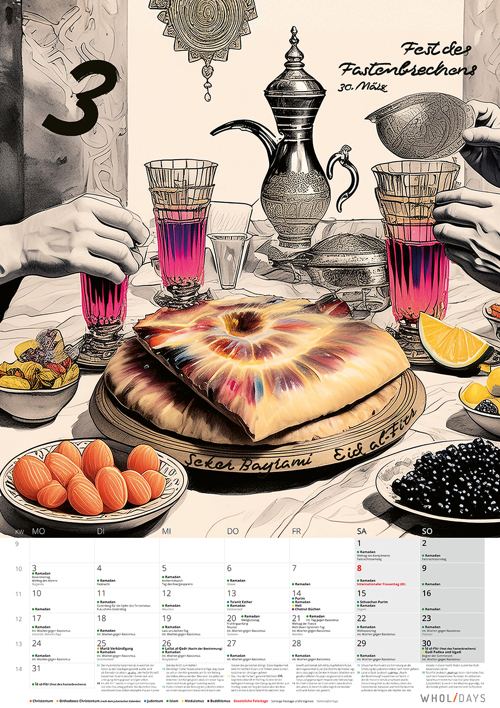 Das intuitive Kalendarium ermöglicht es, eine Vielzahl an Festivitäten mit einem modernen und ansprechenden Layout zu vereinen. wholidays 2025 setzt dabei erneut auf eine Kooperation mit der in Stein b. Nürnberg ansässigen Akademie Faber-Castell.
